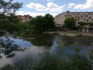 Nous nous sommes garées en bas de la rue des Jardins et sommes descendues vers le pont menant au quartier du Pontiffroy et l’hôtel de police en face. Nous avons marché le long de la Moselle sur le Quai Félix Maréchal, direction le pont de la Préfecture et avons pu observer un héron pêcher dans la rivière. Nous avons ensuite traversé le pont vers la Préfecture puis la place de la Comédie (où se trouve l’opéra-théâtre) qui a revêtu sa parure d’été avec des points verts, des points d’eau, un petit air de fraîcheur en ville, avec toujours la vue magnifique sur le Temple Neuf non loin de là.