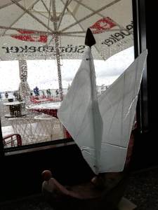 Ce matin, je me suis réveillée et pouf, j’avais un an de plus ! Comme j’ai eu du mal à m’endormir malgré le fait que j’étais fatiguée, je me suis levée tard, j’ai un peu traîné et je me suis mise en route entre deux averses. Je suis descendue au port et là j’ai vu la file d’attente pour l’Ozeanum… impressionnante. Comme prévu, je suis allée au café juste à côté, Pausche, l’intérieur est petit, mais j’ai pu avoir la dernière table de deux, juste à côté de la fenêtre, avec une vue sur la mer et les gens faisant le pied de grue pour l’aquarium, par moment sous la pluie. Du coup, j’ai regardé si on pouvait acheter le billet en ligne, mais il n’y avait rien de dispo avant samedi… et je pars vendredi. Donc, comme je ne veux pas poireauter pendant des heures pour acheter un ticket, j’ai changé mes plans.