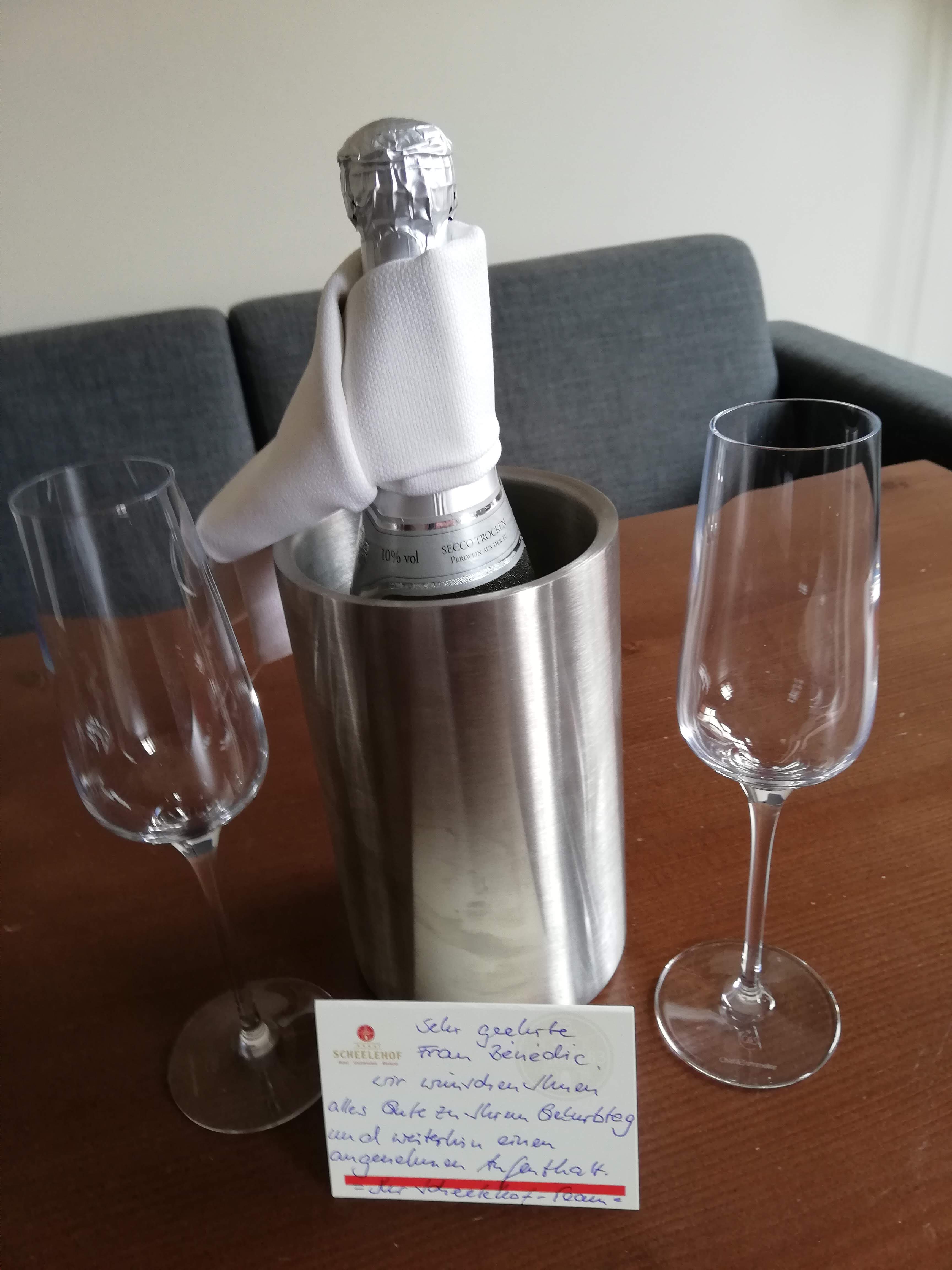 Je suis allée à l’hôtel et, arrivée dans ma chambre, surprise : une bouteille de vin pétillant sur la table, offerte par l’hôtel pour mon anniversaire. C’est super sympa. Bon, je ne bois pas de vin pétillant, mais je vais la prendre avec moi et je l’offrirai à mes parents, après tout, c’est grâce à eux que je suis là, bon du coup ce ne sera pas une surprise, tant pis.