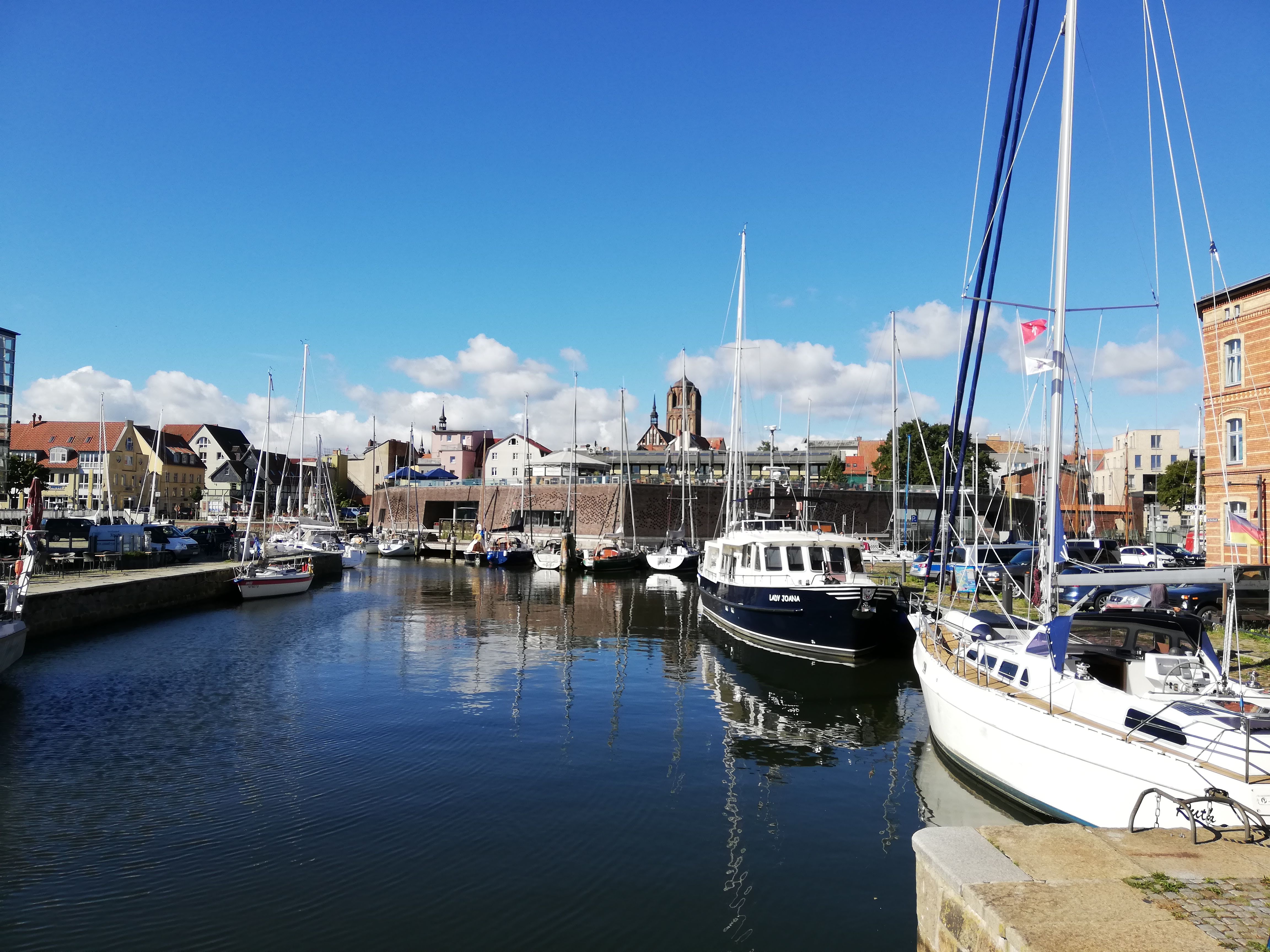 industrie, administration et nature, y’a pas grand-chose. Cela dit, j’ai tout de même profité de la vue depuis la terrasse du restaurant fermé, sur l’étroit passage reliant la marina à la mer et sur Rügen, vraiment joli. Avec en plus un temps agréable, vingt degrés, du soleil par moments, couvert par d’autres.