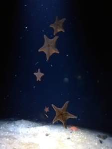 De retour à l’Ozeanum, je vois que personne n’attend pour entrer, ça s’annonce bien, mais avant, je me suis installée à la terrasse du restaurant Speicher 8 juste à côté pour un vrai déjeuner. Une schnitzel toute simple, bon. Puis voilà, l’Ozeanum ! Avant de passer à la caisse, il faut noter ses coordonnées, règle Corona que je connaissais pour les cafés et restaurants, mais pas pour les musées, en Allemagne, c’est différent d’un Land à l’autre. Enfin bref, je prends mon ticket, une autorisation photo, je tourne d’abord en rond, je trouve enfin le sens de la visite puis je retourne vite en bas mettre mon sac à dos dans un casier. Il faut suivre la ligne orange, mais pour la première station (expo sur les mers du monde), l’escalator est hors-service et je suis un peu perdue et finis par prendre l’ascenseur. Voilà, c’est parti ! J’explore ce mélange entre musée et aquarium avec de nombreuses explications et présentations d’un côté et les aquariums de l’autre. Bassins de la mer baltique, de la mer du Nord, de l’Atlantique. L’aquarium des étoiles de mer est particulièrement beau, tout comme celui des méduses. Il y a aussi un aquarium de bouteilles plastiques pour attirer l’attention sur le problème du
