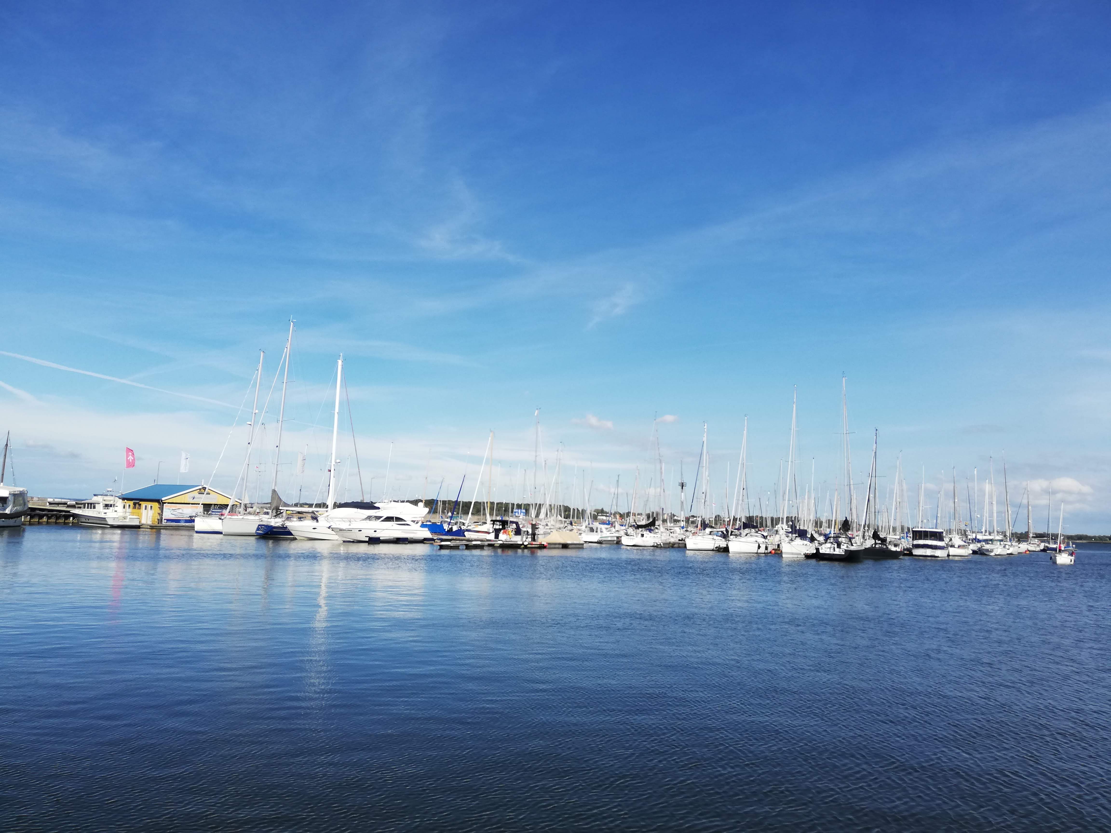 Du coup, je me suis mise en route pour la petite île de Dänholm, quartier de Stralsund entre le continent et l’île de Rügen. D’ailleurs, quand on arrive (à pied, à vélo ou en voiture) sur le pont Ziegelgrabenbrücke (qui se lève, enfin s’ouvre, quelques fois par jour), il y a un panneau « Bienvenue sur l’île de Rügen », alors qu’on y est pas encore. Sur la carte, j’avais vu une petite plage, mais impossible de trouver le chemin, que ce soit avec Google Maps ou Komoot ou mes yeux. Du coup, j’ai suivi les panneaux vers les musées maritimes et je suis arrivée à la marina. C’est super joli, d’un côté il y a une petite forêt, c’est désert, magnifique. J’étais dans le coin sur les coups de midi et le Yacht Club propose un menu déjeuner, mais les deux options ne me tentaient pas (travers de porc ou poisson), cependant j’avais vu un panneau pour un hôtel-restaurant, donc je suis allée jusque là-bas… fermé. Bon, j’avais deux snacks nutella et une banane dans le sac, je me suis posée sur un banc avec vue sur la marina et j’ai mangé mon petit goûter, vu que je ne savais pas quand je retournerais à la civilisation. Dänholm, c’est