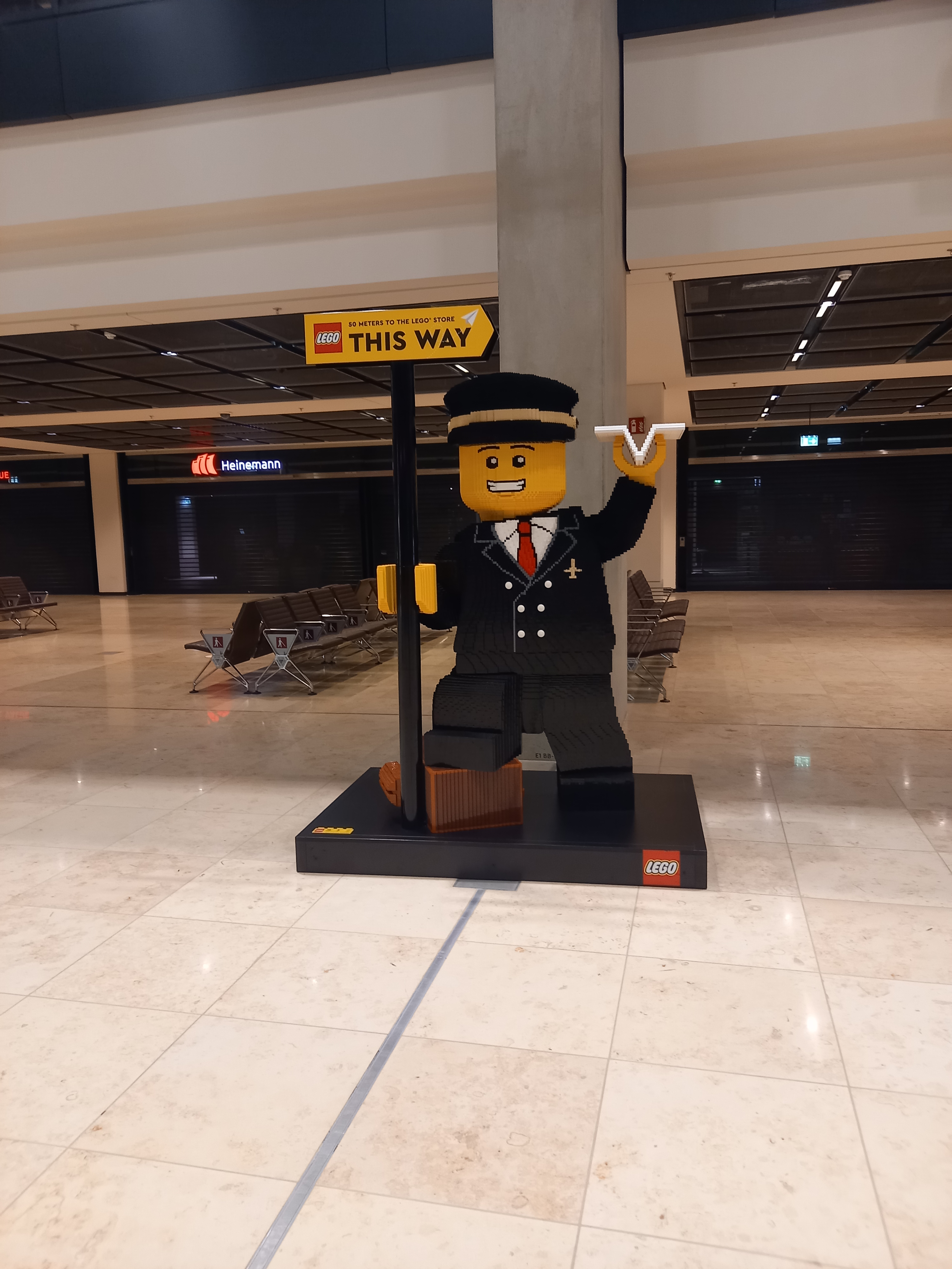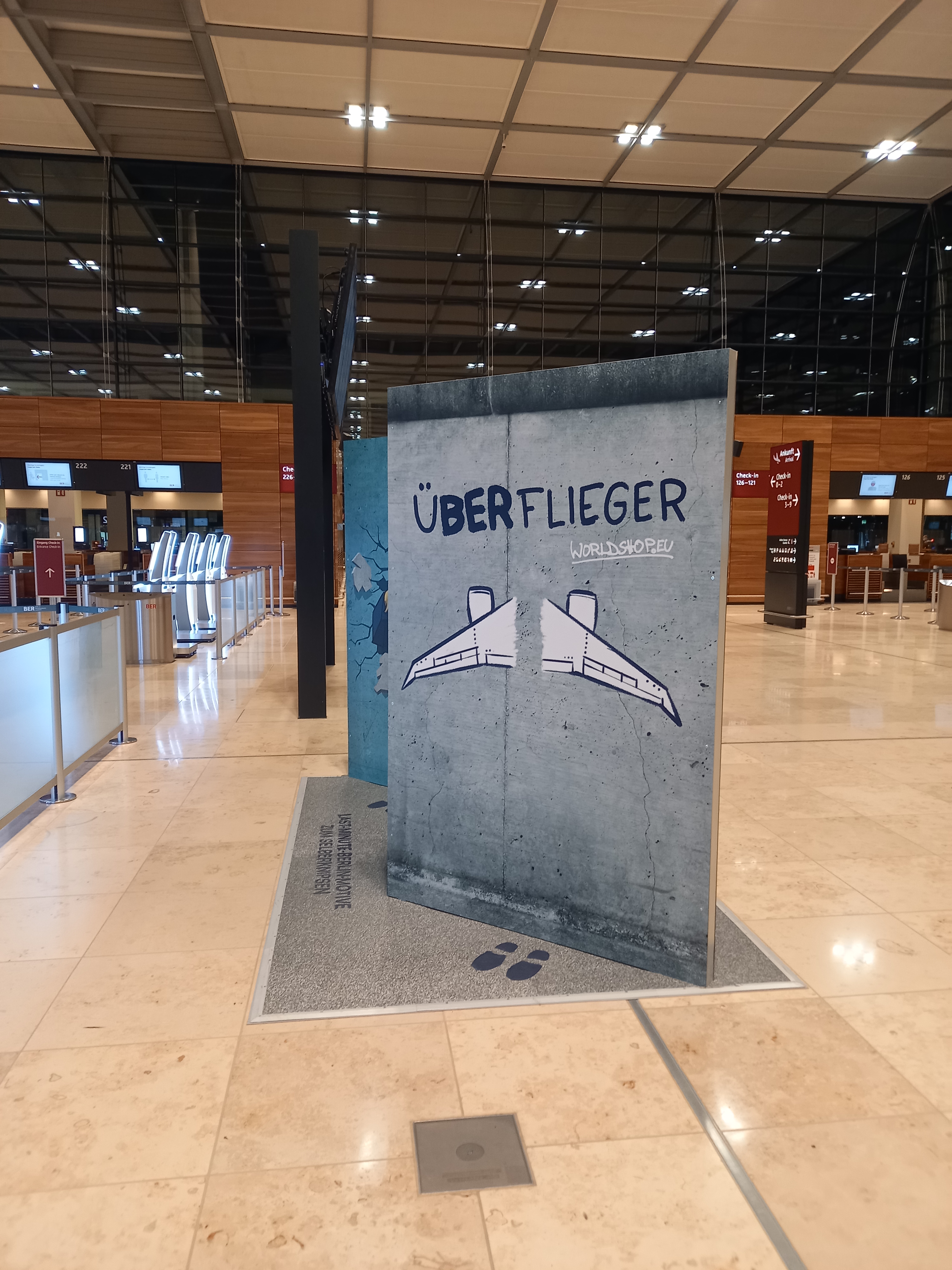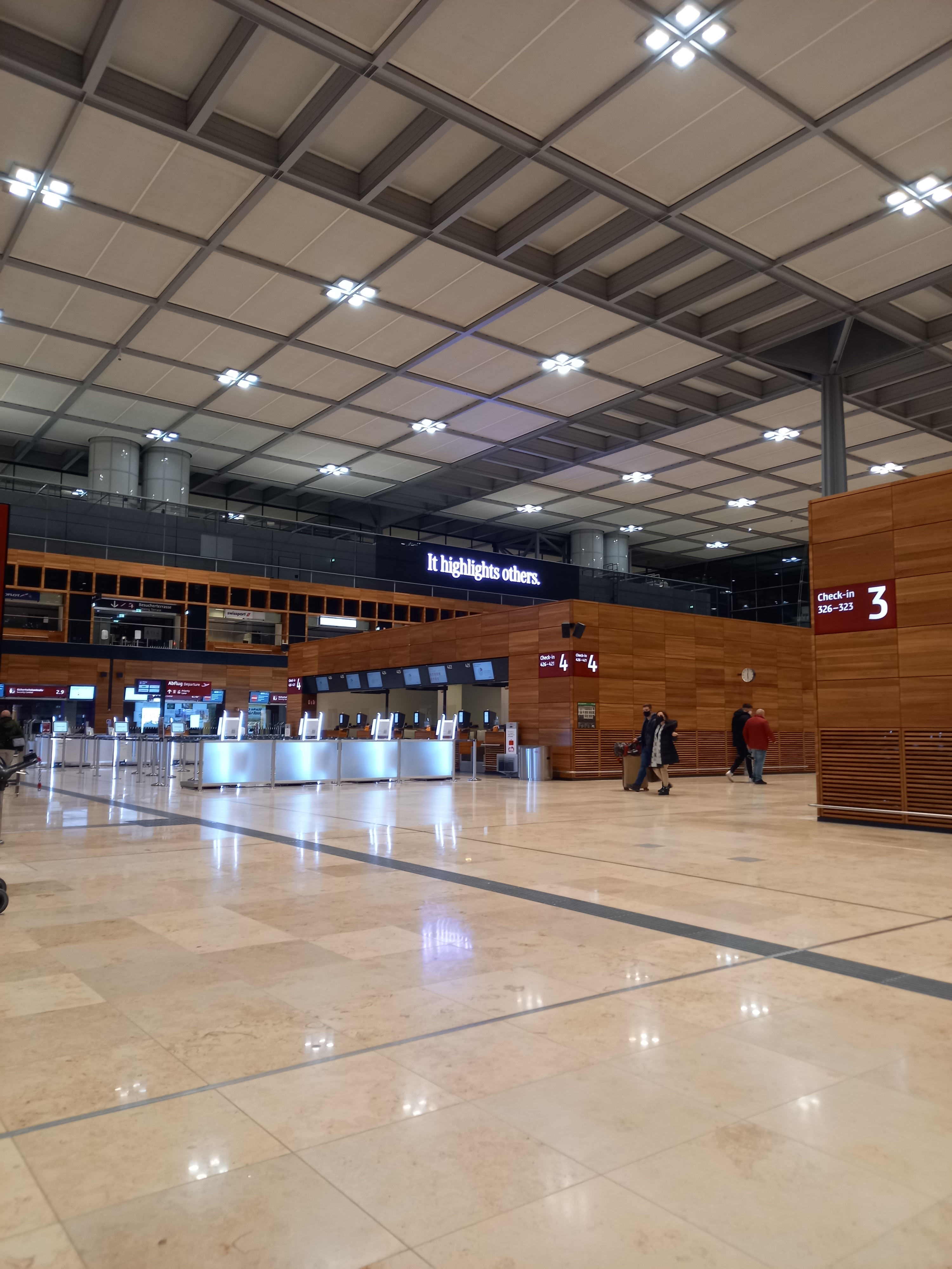 J’aurais normalement dû participer à une journée de test à l’aéroport en septembre, mais en raison d’un dîner pas frais, j’ai dû annuler et prendre mon mal en patience pour découvrir BER. Le jour du départ, après près d’une heure de tram et de train, je suis arrivée directement dans le hall des départs grâce à un ascenseur reliant la gare au terminal 1 (mais apparemment les escalators entre la gare et le terminal montent seulement, y’en a pas pour descendre). C’est très joli, bien aménagé, bien propre, y’a plein de magasins, notamment après la sécurité, mais forcément tout était fermé, j’ai quand même pu trouver de quoi m’acheter un sandwich pas bon et des chips. Y’a aussi de beaux tapis roulants, ce serait mieux s’ils fonctionnaient, et dans un couloir, je ne sais pas si c’est un style voulu, mais on a l’impression qu’ils ont oublié de finir le faux plafond…
