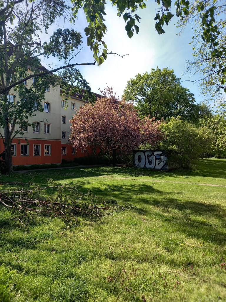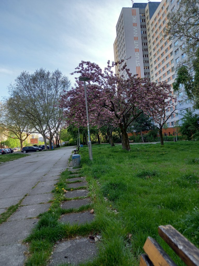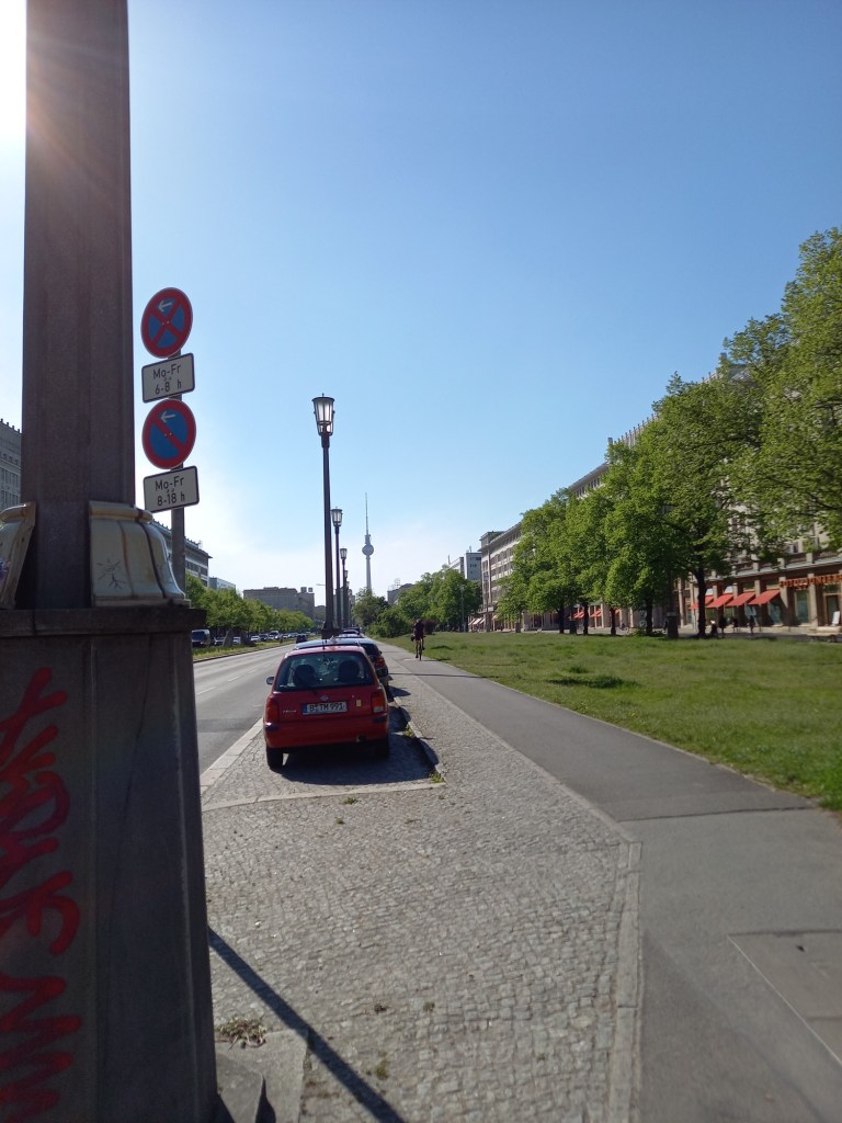 Le début est assez similaire au parcours que j’avais fait jusqu’à la Fernsehturm il y a quelques semaines, avec quelques petites variations. On commence donc sur Antonplatz, comme souvent… De là, je remonte légèrement la Berliner Allee direction Mitte avant de prendre à gauche sur Rossinistrasse, puis à droite sur Bizetstrasse et à nouveau à gauche pour m’engager sur Gurtelstrasse. Au bout de quelques mètres, je prends à droite un petit chemin devant un immeuble pour traverser vers les espaces verts du quartier résidentiel de Michelangelostrasse. Une fois arrivée de l’autre côté, au bord de la grande route, je continue de remonter la rue jusqu’à Kniproderstrasse et tourne à droite. Cette fois aussi, j’arpente la très longue avenue, jusqu’à arriver, plusieurs kilomètres plus tard, au carrefour avec Danziger Strasse.