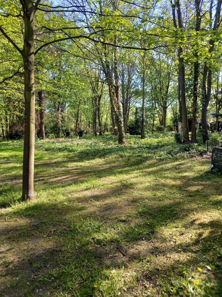 Là, je tourne à gauche, aux abords du parc Volkspark Friedrichshain, puis je prends à droite pour longer le parc sur Margarete-Sommer-Strasse avant d’entrer dans le parc en lui-même. Je longe les terrains de beach volley, aires de jeu et autres rampes de skate jusqu’à arriver derrière l’hôpital Klinikum in Friedrichshain et ressors du parc sur Virchowstrasse. Là, une pause qui s’impose. Au début du parcours, y’avait des bancs partout, de nombreuses possibilités de s’asseoir à l’ombre, mais dans la partie du parc où j’étais les rares bancs à l’ombre étaient occupés et les rares bancs libres en plein soleil. Alors je me suis posée sur une grosse roche près d’une entrée de l’hôpital, à l’ombre du mur. Une fois un peu requinquée, par cette chaleur les pauses eau et repos sont importantes, je remonte la rue. Arrivée au croisement avec Landsberger Allee, je prends à droite, vers l’entrée principale de la clinique. Là, je traverse la route pour entrer dans le cimetière de la paroisse St George. C’est un lieu étonnamment agréable, de nombreux bancs, des arbres, beaucoup de verdure. J’y ferai même une petite pause.