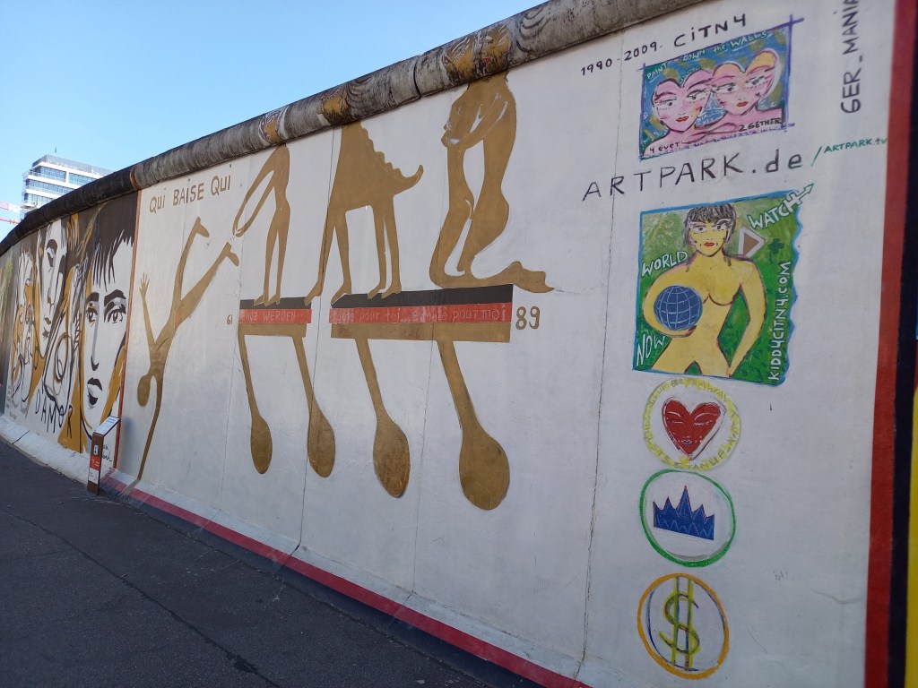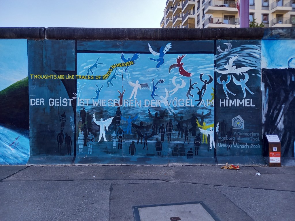 Je suis ressortie du cimetière sur Friedenstrasse, près de Straße der Pariser Kommune (oui oui, la rue de la Commune de Paris), sur laquelle je me suis alors engagée pour la faire en entier. Encore une longue rue, qui fait un peu plus d’un kilomètre. À la hauteur de Franz-Mehring-Platz, j’ai fait une petite pause à l’ombre des arbres en fleurs avant de me remettre en route, toujours tout droit, jusqu’à la gare Ostbahnhoff et la fameuse East Side Gallery, pour une fois sans masse de touristes. C’est un ancien pan du mur de Berlin au bord de la rivière Spree, autrefois frontière entre Berlin-Est (le côté où je me trouve) et Berlin-Ouest, qui arbore des œuvres d’art où domine le thème de la paix, effectués par des artistes au début des années 1990 et en 2009. C’est juste dommage qu’ils construisent beaucoup en ce moment à cet endroit.