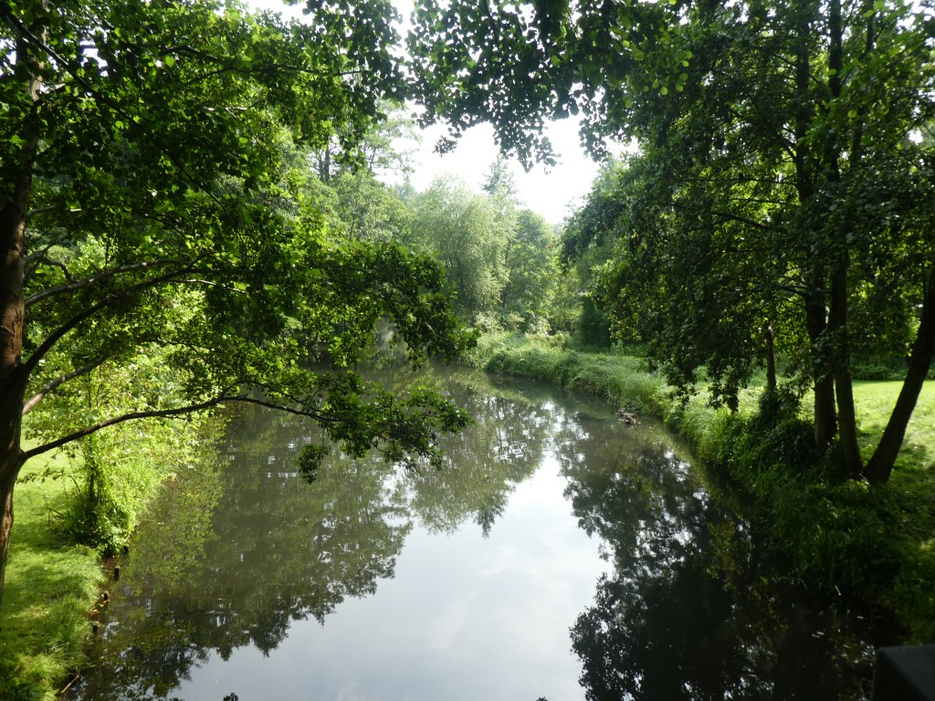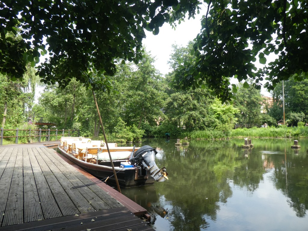 Arrivées à destination, nous nous sommes mises en route vers le centre-ville, traversant une petite forêt, le temps était nuageux mais chaud, assez agréable. Nous avons fait une première pause sur la place du marché et avons visité l’église Paul Gerhardt (un célèbre auteur de chants religieux allemands du 17e siècle). Ensuite, nous sommes descendues vers les canaux, cherchant où faire un tour en longue barque. Quand nous pensions avoir trouvé, ils étaient déjà complets, le Monsieur nous a alors expliqué que nous étions au port n°3 et qu’au n°1 ou 2, nous trouverions plus facilement sans réservation. Alors, nous sommes allées vers le centre touristique et avons vite repéré un tour qui partait trente minutes plus tard.