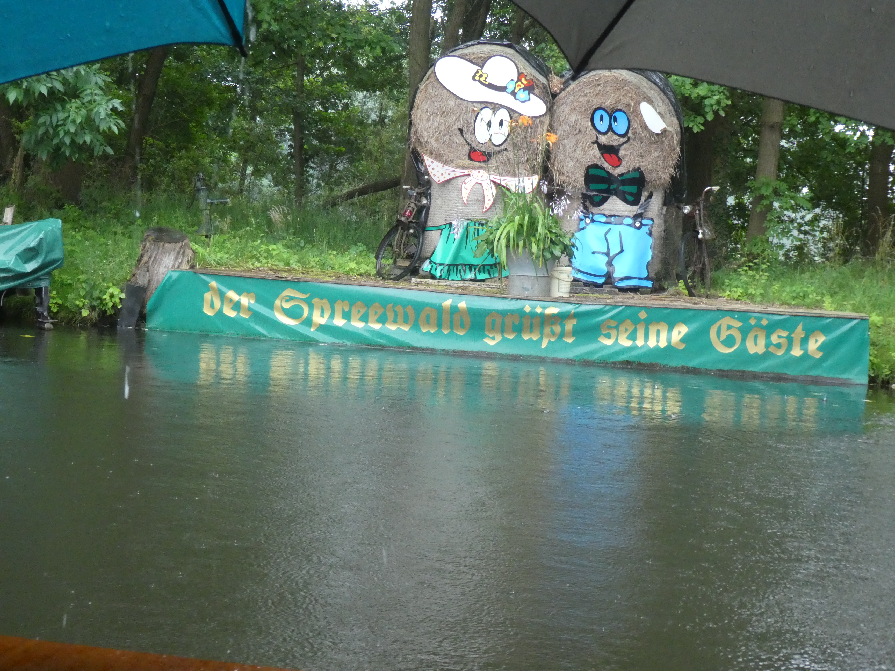 Nous avons embarqué sous le soleil, prenant place sur un banc d’un côté d’une table, une famille s’installant bientôt en face. Le batelier nous a accueillis chaleureusement, sur la petite table il y avait une petite corbeille avec des mini bouteilles de différents schnaps. Alors pour bien commencer la balade, nous avons trinqué, je n’ai pas été très aventureuse et j’ai pris une liqueur à la griotte, les filles, elles, au cornichon (le cornichon c’est LA spécialité du coin). Il y en avait aussi à l’asperge (ce qui ne m’étonne pas vu l’amour des allemands pour l’asperge), mais non, merci, ça ira. Et sur ce, nous voilà partis pour 1h30-2h sur les canaux de la Spreewald, passant des écluses, perdus entre les arbres dans ces marais. C’était superbe. Mais humide… la pluie s’est vite invitée à la fête, j’ai sorti ma veste de pluie, pour le reste du bateau, ce fut les grands parapluies rangés sous les tables, c’était assez comique. Quand la pluie était plus intense, on profitait d’un passage sous un bon pont pour s’abriter quelques minutes. C’est vraiment bien tombé par moments, on a quelques fois entendu le tonnerre au loin. Dans le parcours, il y a un arrêt prévu au Gurkenstand (le stand des cornichons) où on peut, tout en restant dans la barque, acheter des cornichons à manger tout de suite ou à emporter, sous diverses formes, mais aussi de quoi se réhydrater ou caler une petite faim. Ils ont été gentils et ont étendu leur store côté canal pour nous abriter. Entre averses et éclaircies, la balade était sympa, même si j’étais trempée à la sortie.
