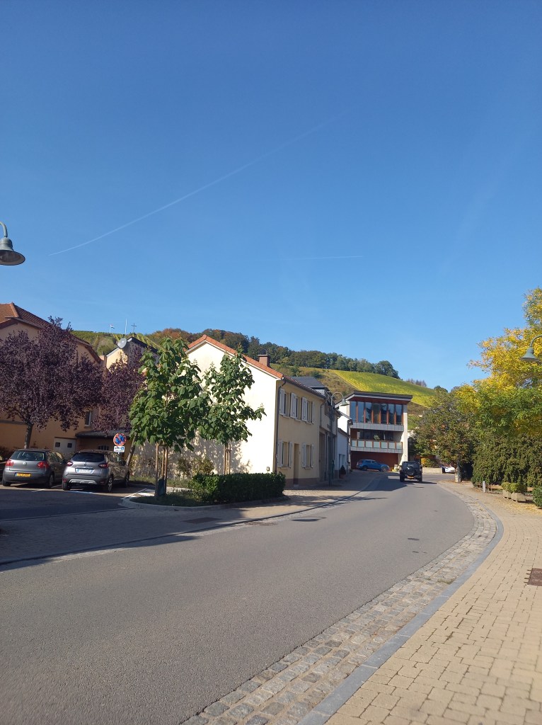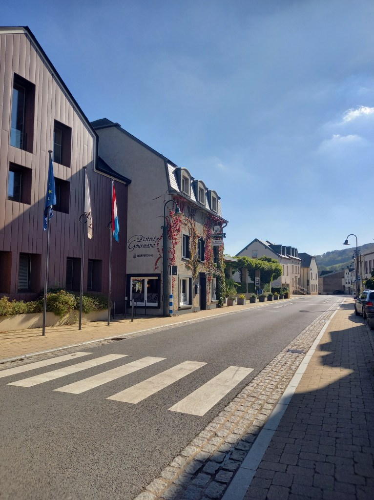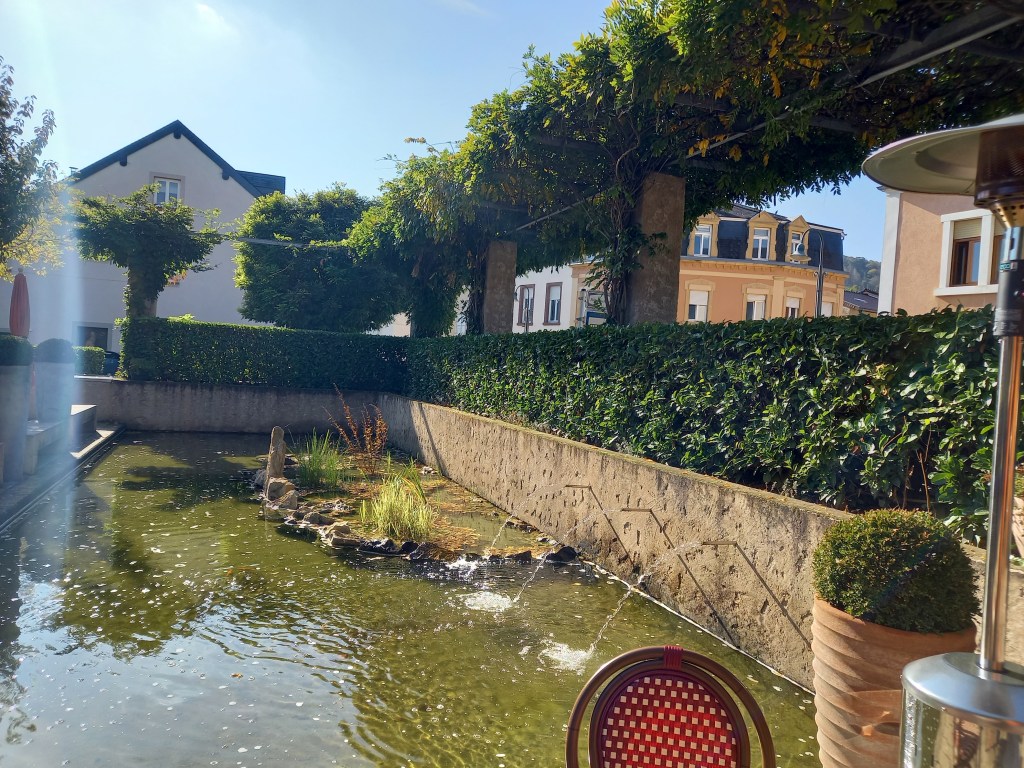 Toujours pendant ma visite en Lorraine, nous sommes allés du côté du Luxembourg, sur la route des vins de Moselle, plus précisément à Remerschen et Schengen. Schengen pour faire des courses et le plein d’essence. Mais avant cela, nous sommes allés déjeuner à Remerschen juste à côté, une petite ville surplombée par des vignes.
