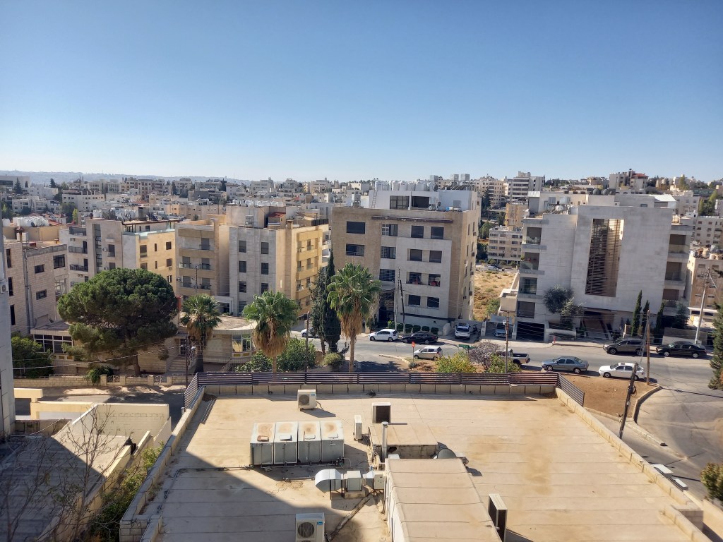 Après une assez longue attente, enfin, on embarque, au revoir Berlin, le froid et la pluie. La météo pour Amman pour les quinze prochains jours : soleil et en moyenne 25°C, les autres endroits, ce sera pas trop différent. Après environ quatre heures de vol avec Royal Jordanian, nous arrivons. Youhou ! Enfin ! Tout d’abord, passage au checkpoint santé, je donne mon papier et on décore mon passeport d’un autocollant « vacciné ». Ensuite, passage pour retirer de l’argent. Une de mes cartes ne fonctionne pas, je crois que j’ai atteint le plafond, mais normalement ça revient à zéro demain. Heureusement, j’ai prévu un peu de liquide et une autre carte qui elle fonctionne, mais c’est en prépayé, j’espère que ce que j’ai mis dessus tiendra jusque lundi car je crains que le virement que je viens de faire n’arrive pas avant, enfin bref…