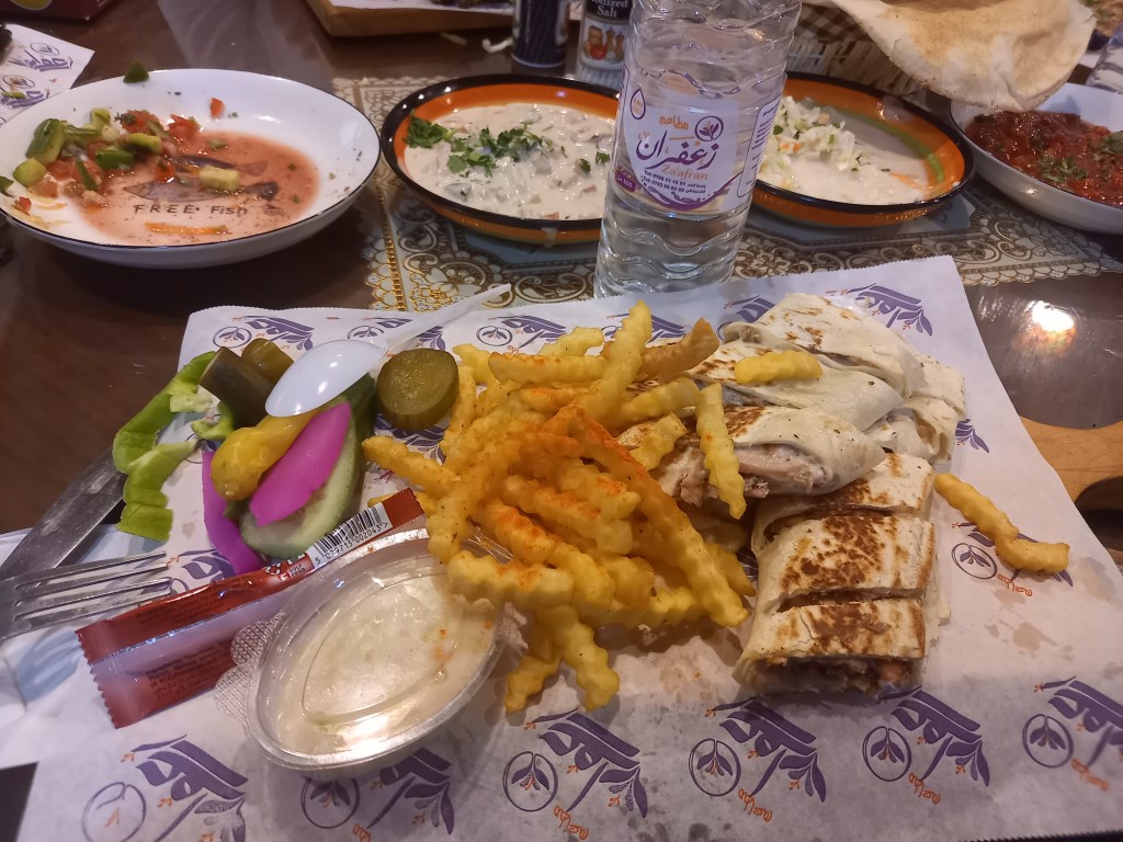 Vers 18h, je suis descendue pour le rendez-vous avec le groupe et le guide. Enfin une partie du groupe, on sera douze en tout, on était sept à être là à l’heure, d’autres arrivaient plus tard. Le guide nous a dit comment tout se déroulerait, on a commencé à faire connaissance. Ensuite, on est allés dîner ensemble pas loin de l’hôtel. Un petit resto que le guide connait, ils nous ont offert des entrées, diverses salades, bon c’est pas mon truc, mais y’avait des petits cubes de tomate avec une sorte de crème, avec le pain plat là, ça passe. J’ai pris un shawarma, du poulet dans le pain plat avec une sauce et des frites. Et ils nous ont aussi offert des desserts, pas mauvais, mais j’ai pas pu tout manger, lourd et sucré, et le sucre je dois éviter.