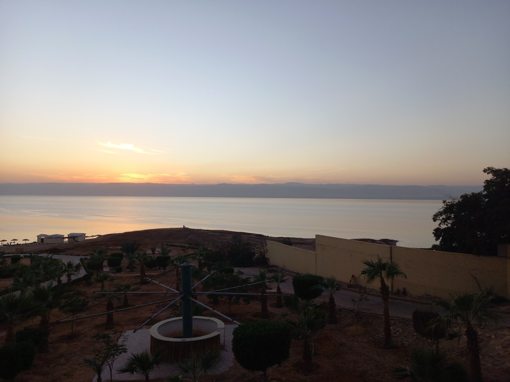 Après près de deux heures de baignade, on est allés au bar du complexe, vue sur la piscine et la mer, avec ensuite le coucher de soleil. Une très belle après-midi. Et on a un bon groupe, y’a une bonne ambiance déjà, on a aussi un groupe WhatsApp pour échanger les photos groupées. Ensuite, retour à l’hôtel à Amman, avec un arrêt à la même aire d’autoroute qu’à l’aller. Certains vont manger dehors ce soir, mais je suis claquée et demain on part à 6h50, donc lever à 6h. J’ai pris une bonne douche, mes cheveux étaient remplis de sel, et je vais manger dans ma chambre avec ce que j’ai acheté hier au supermarché, après je prépare mes sacs car demain on quitte l’hôtel. Et au lit assez tôt.