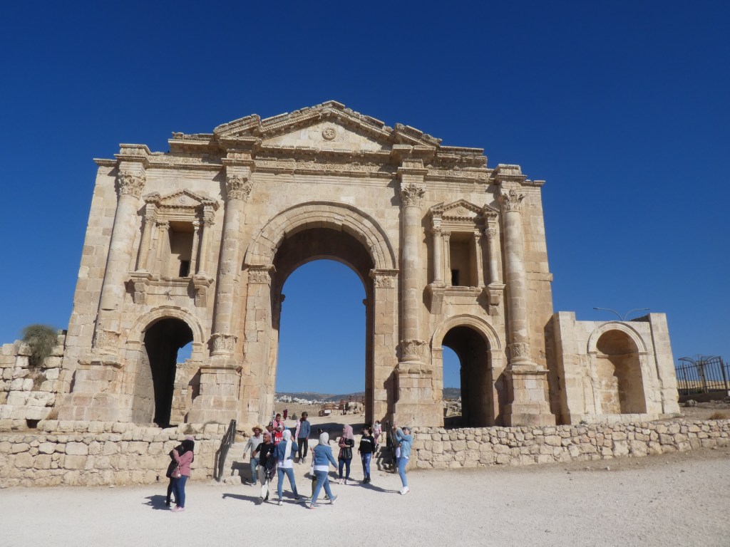 Ce matin, le réveil fut dur, un rapide petit-déjeuner et à 8h j’ai retrouvé le groupe. C’est parti ! Sous le soleil, direction Jerash, une ancienne ville romaine, les ruines les mieux conservées hors d’Italie. On sillonne les routes dans un paysage rocheux et d’aspect aride, avec quelques pins et oliviers parsemés par-ci par-là, des bâtiments aux lignes droites, assez clairs. On a fait un arrêt pour boire un café turc apparemment super bon, mais je ne bois pas de café. On est ensuite arrivés à Jerash sous un soleil ardent. Après avoir traversé le petit marché, on arrive à la porte d’Hadrien, dédiée à l’empereur comme son nom l’indique. C’est donc l’entrée principale. On s’est baladés avec notre guide dans cet endroit grandiose qui a vu défiler tant de siècles. Jerash a été grecque, romaine, puis musulmane. On arpentait cette ancienne cité romaine de Jordanie quand d’un coup, des cornemuses. J’ai pensé que des Écossais étaient dans les parages, mais… Ah ah, je le dis pas tout de suite. Y’a pas beaucoup d’endroits à l’ombre et le sol est rocheux ou couvert de vieux pavés romains, y’a aussi pas mal de marches. J’ai été rapidement reconnue comme le maillon faible du groupe, on me demandait si ça allait, le guide me disait de bien prendre mon temps, ils m’attendront. Super sympa. Et je suis contente d’avoir investi dans des bâtons de marche, ça aide bien. Enfin bref, après avoir monté les millions de marches jusqu’au temple de Neptune, j’ai pu m’asseoir un peu à l’ombre, un des marchands m’a même prêté un coussin (alors que la pierre ça va hein, mais c’est gentil). Là on a fait une belle photo de groupe panoramique et le guide nous a montré sa force herculéenne. Il y a une colonne, si tu sais comment faire, tu peux la faire bouger en poussant. Sur ce, nous sommes allés à l’ancien théâtre et le mystère de la cornemuse a été révélé : ce ne sont pas des Écossais, mais des anciens militaires jordaniens, c’est assez courant dans l’armée. Après, on a pu se promener seuls, c’est vraiment un endroit magnifique.