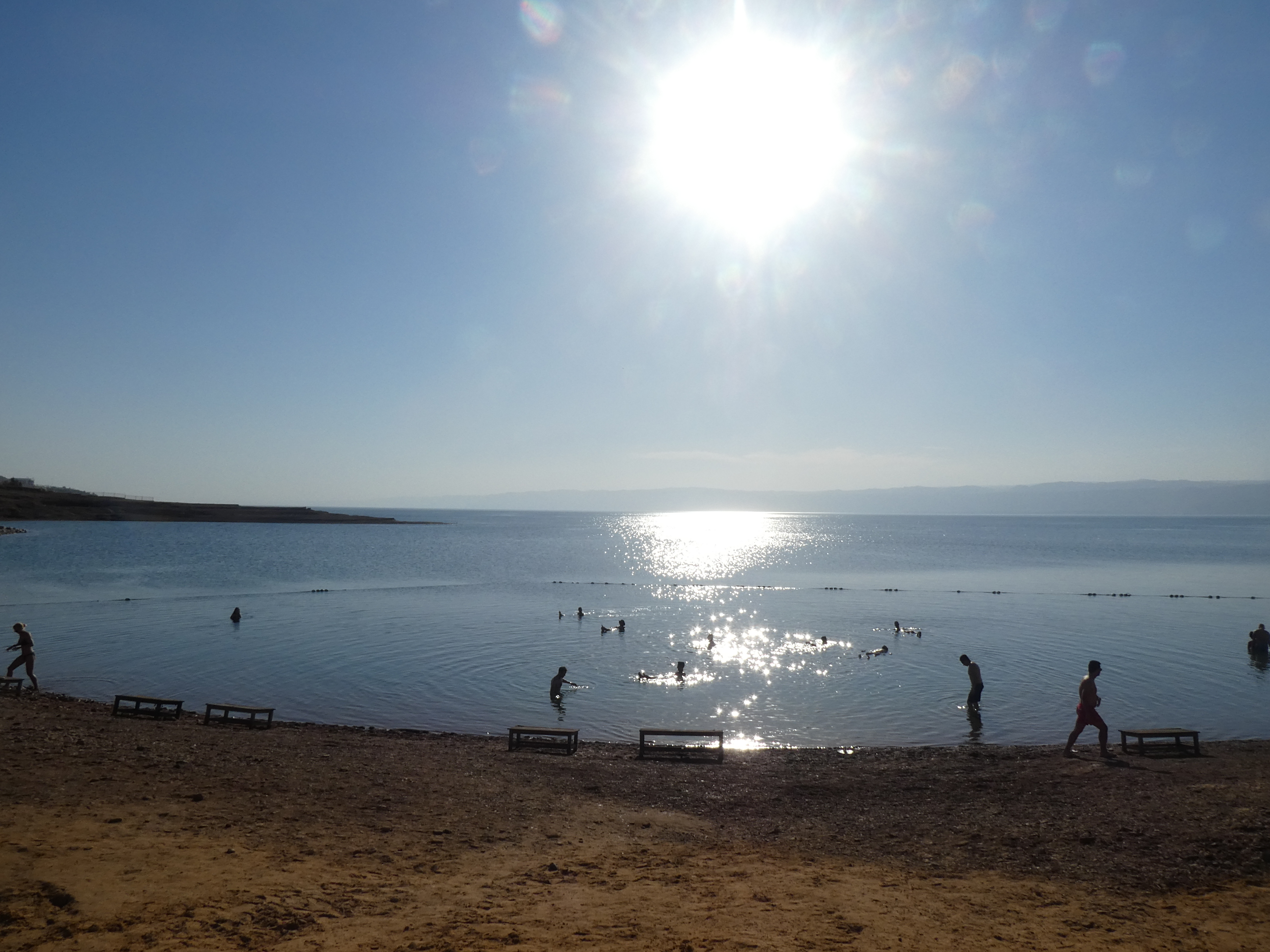 Sur ce, nous avons pris la direction de la mer Morte, qui se trouve à 400 m sous le niveau de la mer, du coup je me demande comment il est calculé ce niveau. On a fait un arrêt rapide au niveau 0. Et on sent la descente à altitude négative, avec les oreilles qui se bouchent légèrement. La température monte également, 25°C à Amman, 35°C au bord de la mer Morte. Notre chauffeur nous a déposés à un complexe hôtelier, on pouvait utiliser les vestiaires et autres sanitaires et bien sûr la plage. Plus on s’approche de l’eau, plus c’est caillouteux. L’eau est fraîche et on flotte vraiment ! Il faut un peu aller contre son instinct, je savais pas trop quoi faire au début, j’ai eu du mal à lâcher prise et me laisser porter sur le dos. C’est vraiment agréable comme sensation. Par contre, le retournement et retour sur les jambes, je maîtrise pas trop, j’ai bataillé et je peux confirmer que l’eau est vraiment très très très salée. Du personnel met à disposition des seaux remplis de boue venue du fond de la mer. On se recouvre le corps de cette boue, on laisse sécher, on retourne dans la mer et on passe ensuite encore sous la douche et on a alors la peau toute douce.