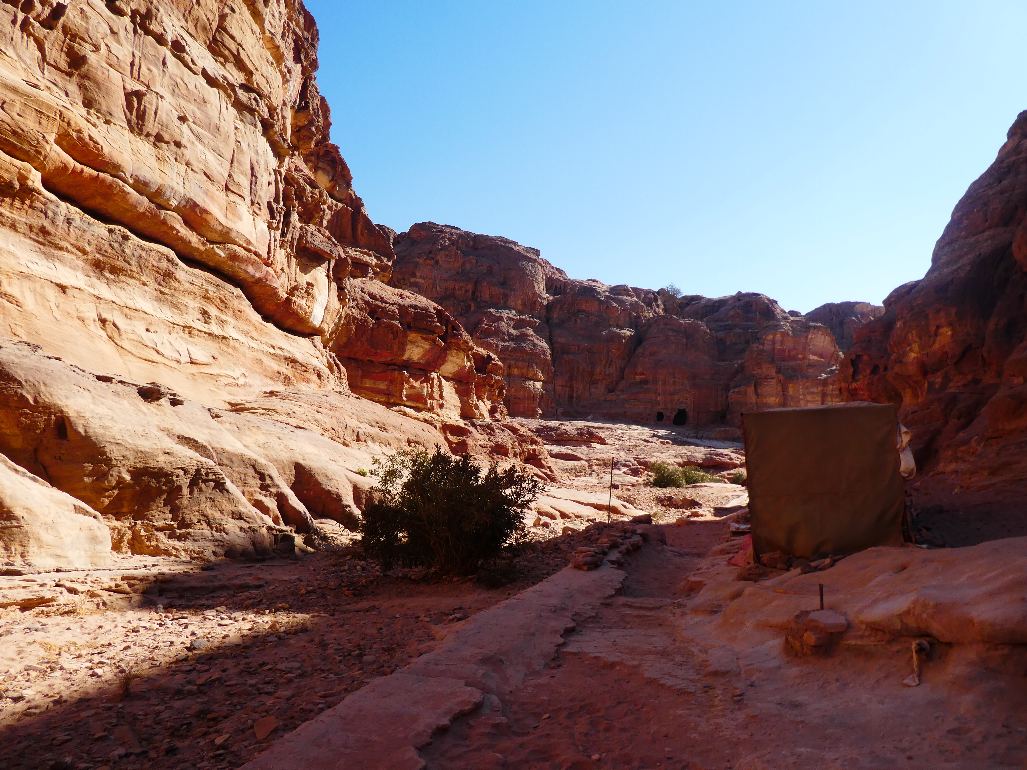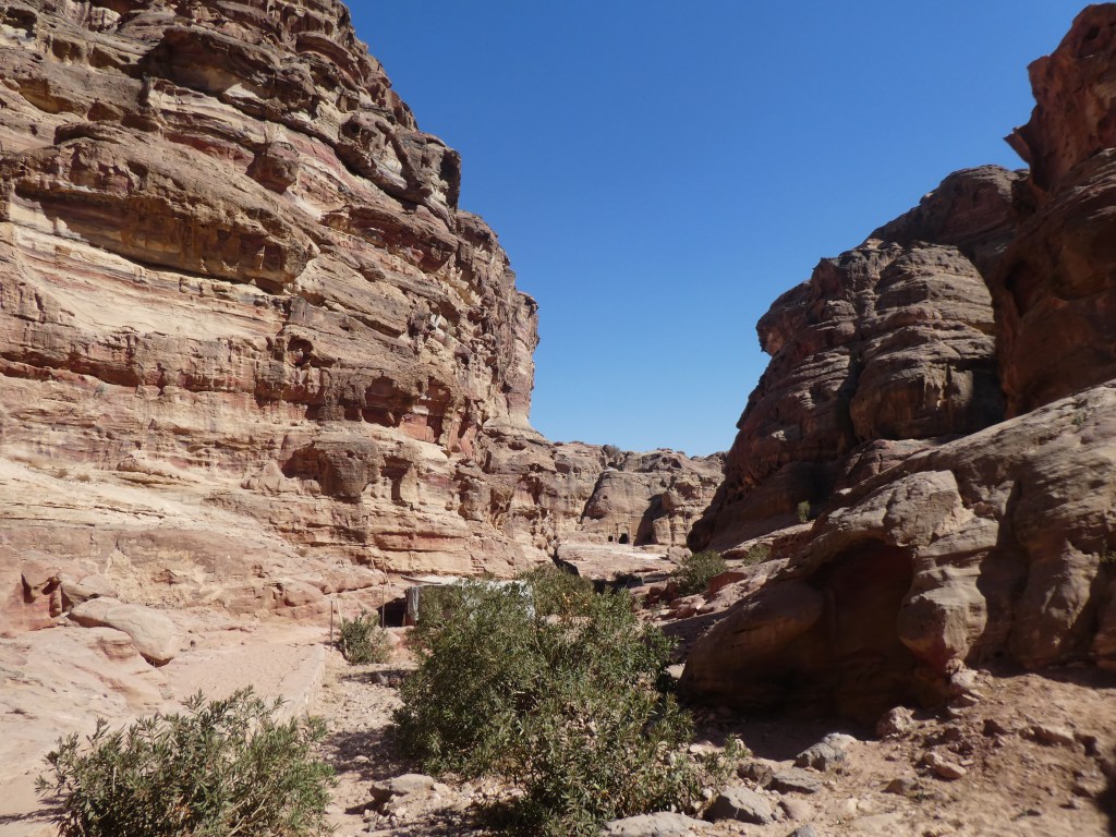 Enfin bref, la descente fut délicate et je suis arrivée en bas moins d’une heure avant que le bus ne reparte. Alors que j’essayais de repérer un endroit à l’ombre pour me poser et prévenir le guide que je serai en retard, on m’a proposé de voyager en cariole tirée par un cheval, pour aller jusqu’à la Trésorerie. Il m’a dit, 25 JOD, arf non, c’est un peu cher, normalement c’est 30 mais pour vous 25, 20 ? OK, 20. Et c’est parti, une chevauchée fantastique et agitée dans la vallée et je me rends compte que le chemin est bien plus long que ce que je croyais, donc c’était une bonne idée, ça m’aurait pris un temps fou à pied.