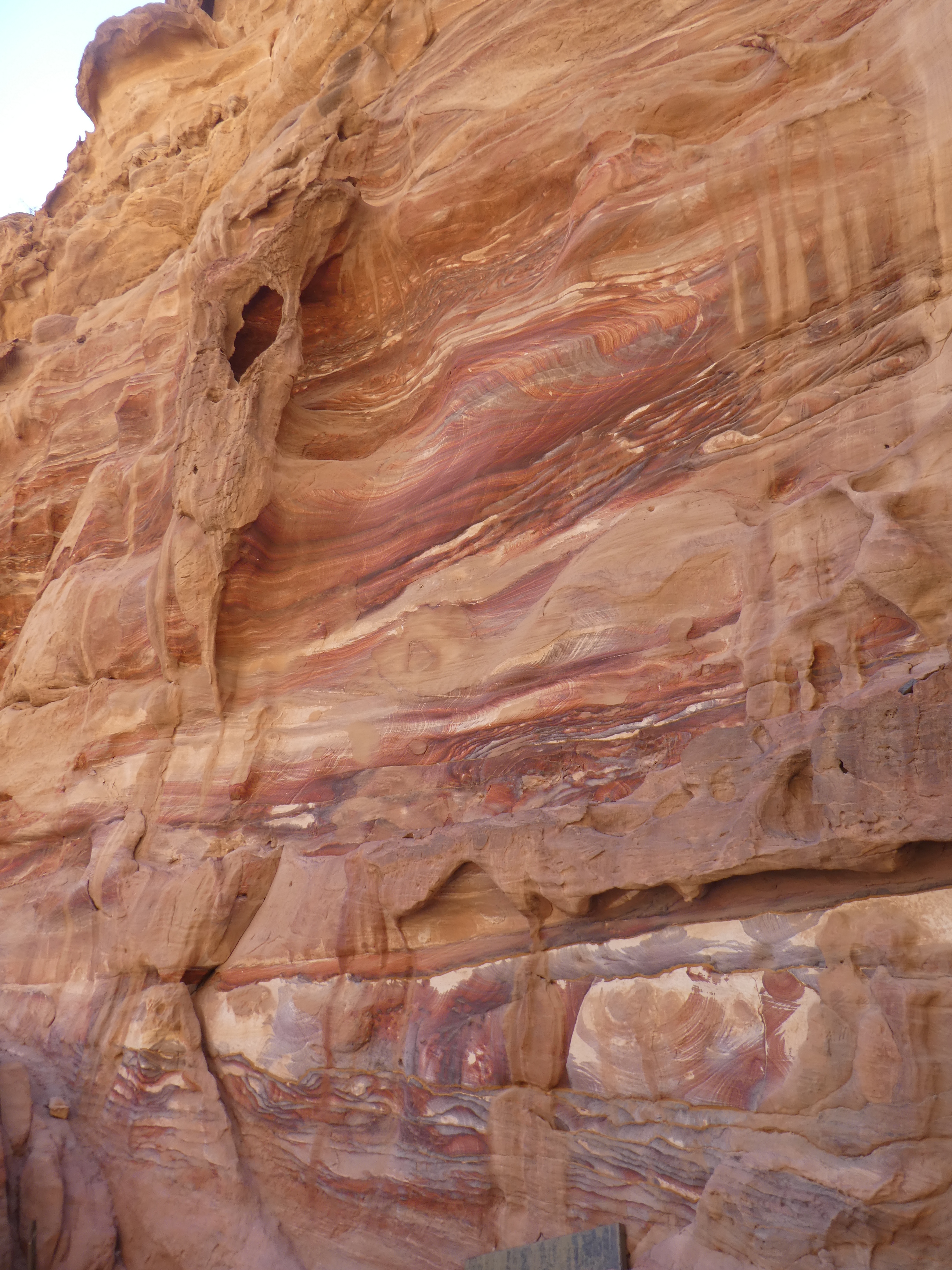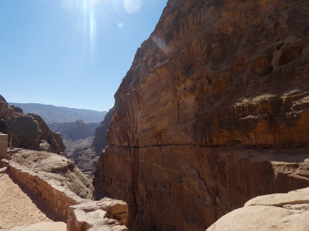 Donc, l’ascension vers le Monastère. Je savais que ce serait difficile. Je ne voulais pas l’option à dos d’âne, la pauvre bête, je fais quand même plus de 100 kg hein. J’ai donc bien pris mon temps, avançant lentement mais sûrement dans ce sublime paysage, faisant de nombreuses pauses. Par moments, j’ai pu m’asseoir sur une pierre, souvent à l’ombre, me retrouvant seule, admirant ces géants de pierre tout autour de moi, le vent jouant dans mes cheveux et mon corps en surchauffe se réjouissant de ce souffle de fraîcheur. Il y a des « marches », hautes, irrégulières, certains endroits sont vraiment difficiles, mais personnellement l’effort en valait la peine. Avancer entre ces parois rocheuses aux mille couleurs (oui, j’exagère, pas mille, mais plusieurs, ocre, rouge, jaune, gris, blanc, une touche presque bleutée par-ci par-là), avec des vues sur la vallée et les autres sommets plus loin, les autres falaises sculptées pour créer cette ville magique, avancer dans ce cadre pittoresque vaut chaque goutte de sueur.