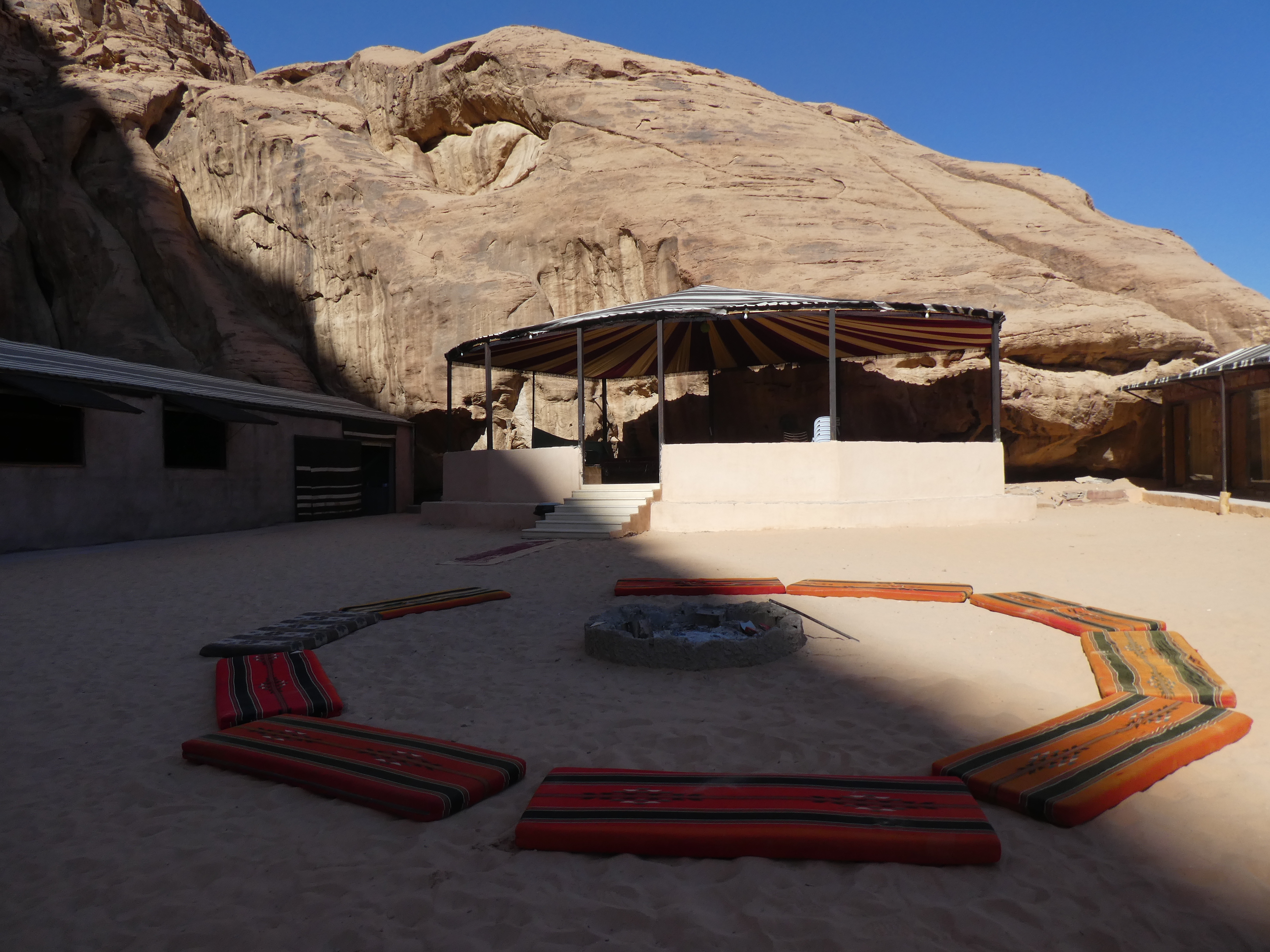 Après un bref arrêt au centre des visiteurs, nous sommes allés au village voisin où nous attendaient nos jeeps. On a dû prévoir un sac pour la nuit, car les sacs de voyage prenaient trop de place. On est donc montés à bord des jeeps pour aller au camp « bédouin ». À l’arrière de la jeep, des bancs sont installés, une couverture attachée au-dessus pour protéger du soleil, on s’accroche où on peut et c’est parti ! Je pensais qu’on serait dans des tentes, mais en fait y’a des genres de petits bungalows, une construction en dur, avec de l’électricité en journée. Les chambres ont même une salle de bain/WC privée. Grand luxe ! On s’est vite installés, puis on s’est réunis pour le déjeuner, un buffet avec salades, riz, purée de patates et carottes, légumes, humus.