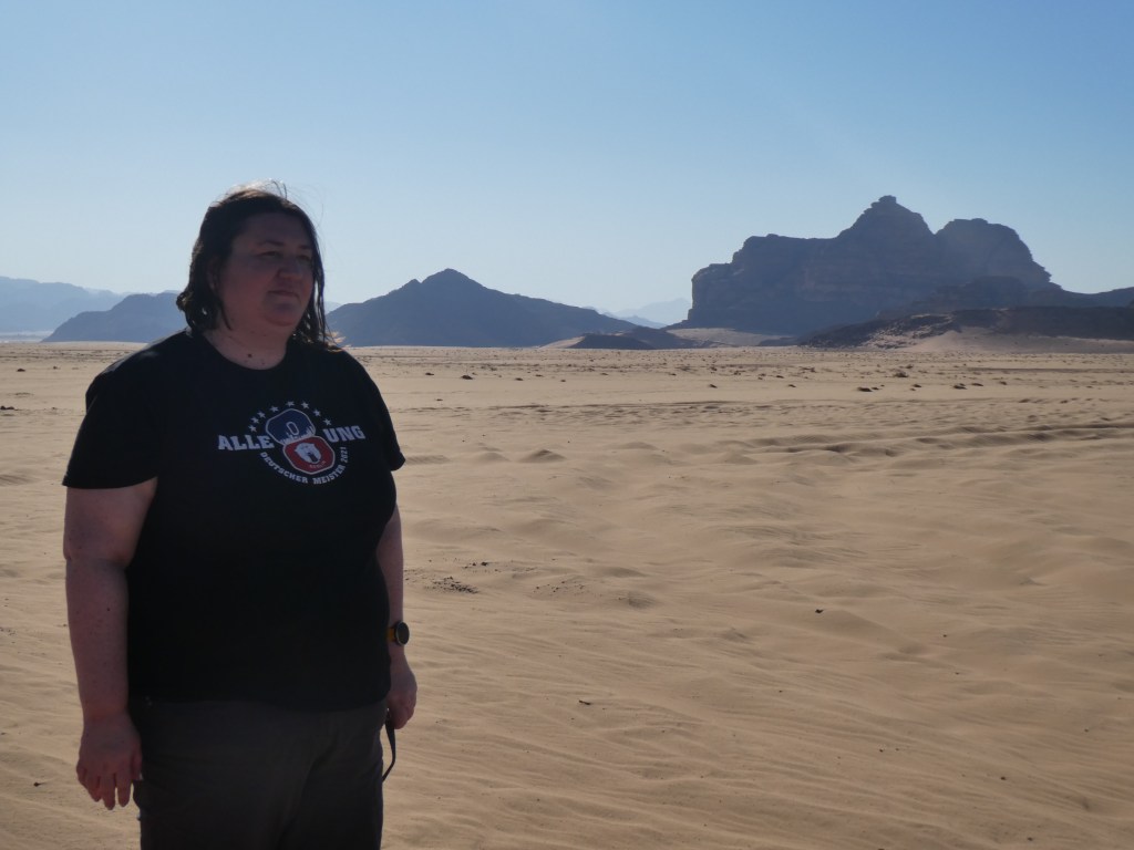 Ensuite, est venue l’heure de partir à l’aventure dans le désert de Wadi Rum. C’est un désert qui sert de décor à beaucoup de films dont Lawrence d’Arabie, Seul sur Mars, Star Wars (un ou plusieurs des trois derniers), Prometheus, Aladdin. D’ailleurs, un des endroits où on devait aller n’était pas accessible pour cause de tournage. Donc, cheveux au vent, nous sommes partis à l’assaut du désert, ma toute première fois dans le désert, le chauffeur a pris certaines dunes, en montée comme en descente, à fond la caisse, c’étaient des montagnes russes, de sacrées sensations. En parlant de dunes, le film Dune a aussi été tourné en partie ici.