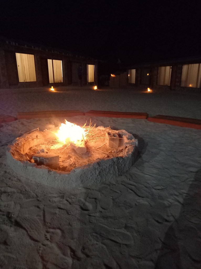 Avec une bonne partie du groupe, peut-être même tous sauf le guide d’ailleurs, on est allés se promener pas loin. On a grimpé une dune, une partie est allée beaucoup plus loin, mais vu que marcher dans le sable de nuit c’est pas très pratique, d’abord en tongs puis pieds nus, je me suis arrêtée avec quelques autres près du camp. Et là, avec très peu de lumière artificielle et un ciel dégagé : wow ! Les étoiles sont magnifiques ! Vraiment superbe. Au bout d’un moment, je suis retournée au camp me poser auprès du feu. Un petit groupe s’est formé autour des flammes, profitant du calme et attendant que le générateur se coupe. On discute à peine, et d’un coup, le camp est plongé dans le noir, il n’y a que les braises du feu et les étoiles, on entend le silence du désert, et aussi mon souffle de bœuf quand je me repositionne sur le matelas dehors. C’était un moment magique. Le tout ensuite ponctué d’aboiements d’un chien pas loin. Au bout d’un moment, je suis retournée dans ma chambre et j’ai dormi tant bien que mal. Car oui, du coup, sans électricité, je ne peux pas utiliser mon appareil pour l’apnée du sommeil, mais une nuit sans de temps en temps, c’est pas grave, surtout que le programme du lendemain était léger.