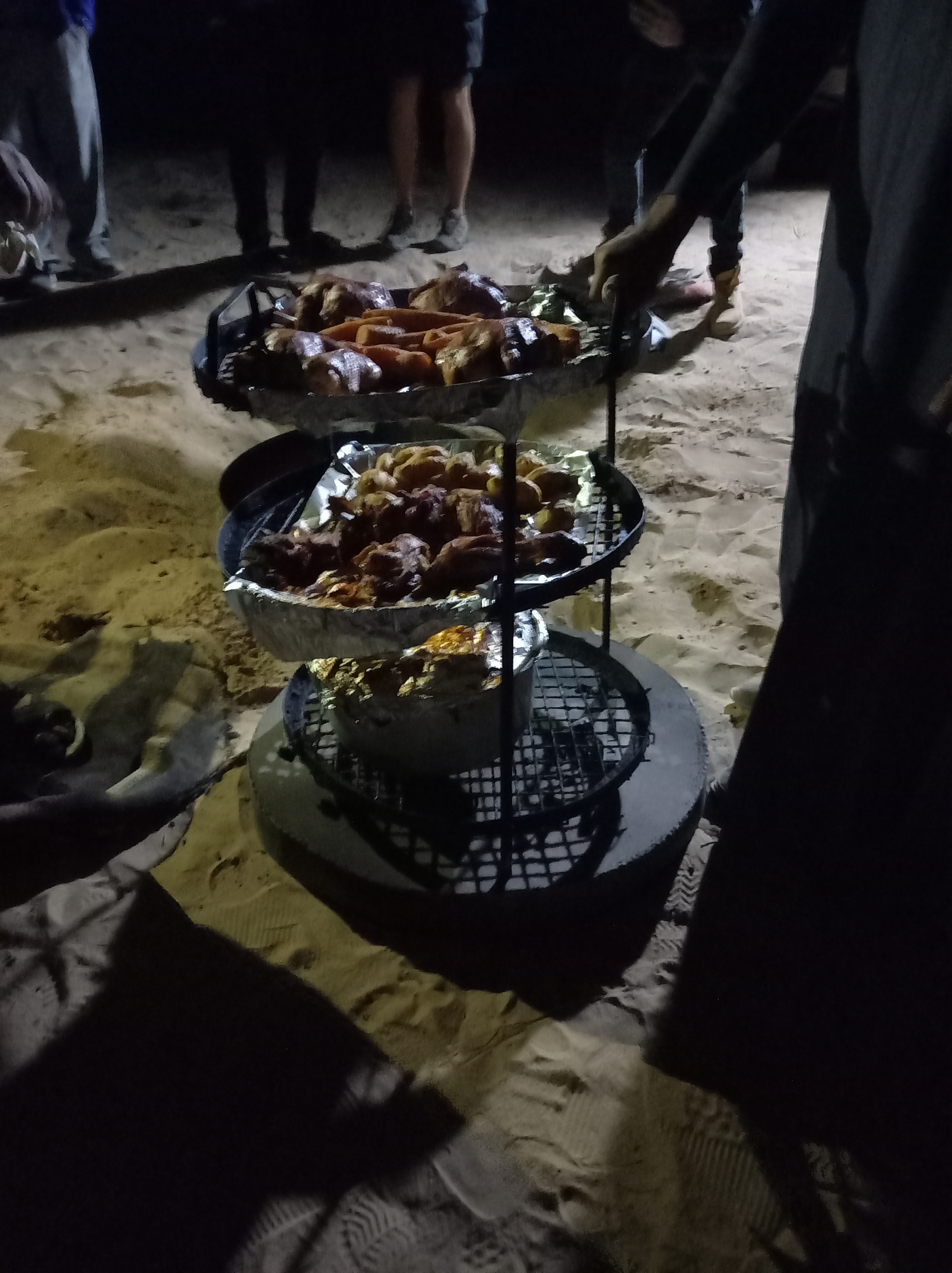 Hier soir, on a eu le droit à un repas bédouin traditionnel, cuit sous le sable pendant trois heures : agneau, poulet, patates, carottes. Le poulet et les patates étaient trop bons ! L’agneau et les carottes j’aime pas ça. Ah, y’avait aussi du riz. Ensuite, on a fait griller quelques marshmallows au-dessus du feu de camp.