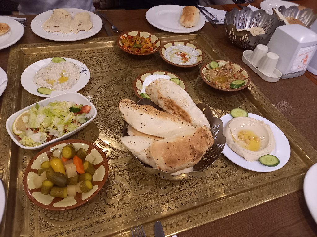 Ensuite, on a repris la route vers Amman pour prendre nos quartiers à l’hôtel, j’ai traîné dans la chambre et un peu dans le lobby avec d’autres du groupe. Puis en fin de journée, nous nous sommes retrouvés pour aller dîner ensemble dans un restaurant célèbre d’Amman : Tawaheen Al-Hawa, ce qui veut dire Moulin. On a pris un grand plat à partager, avec des entrées pour ogres, salades, humus, croquettes viande, croquettes fromage, sauce yaourt et herbes, pain, etc… Puis un grand plat de viandes suivi encore de desserts, dont des fruits et le serveur nous coupait même nos pommes. Franchement bon. Une bien belle soirée.