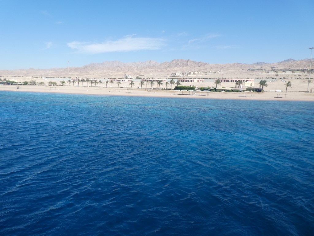Donc, ce matin, on est repartis du camp, d’abord en jeep et un du groupe a d’ailleurs pu en conduire une, et apparemment il s’est bien débrouillé. On a ensuite retrouvé notre fidèle bus et super chauffeur au village aux portes du désert et on a pris la route vers Aqaba au bord de la mer Rouge. Après une petite heure de route, on est arrivés à l’hôtel et le guide s’est arrangé pour qu’on puisse déjà aller dans nos chambres. Une heure plus tard, je retrouvais une grosse partie du groupe pour aller faire un tour en bateau. À la marina d’un grand complexe hôtelier, on a embarqué sur le Diversity, ils organisent des sorties plongée sous-marine et plongée avec masque et tuba. On a d’abord pris d’assaut le pont le plus haut. On est alors très près de la frontière israélienne, et de l’autre côté, y’a un palais royal, du coup au début, on n’a pas le droit de prendre de photos.