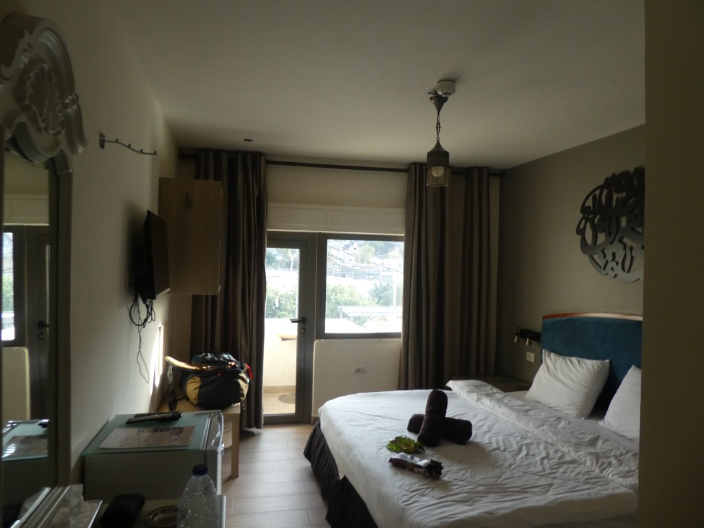 C’est une belle chambre, un grand lit, un petit balcon avec une jolie vue sur le théâtre romain. Je m’installe un peu pour lire, puis je prépare un sac de linge à laver, l’hôtel propose le service. Et en remontant, je me rends compte que j’ai mis tous mes pantalons, il me reste juste un pantalon de jogging avec une tache de vernis dessus… J’ai encore l’option d’une longue robe avec un T-shirt par-dessus pour sortir le samedi… J’achète quelques snacks dans une petite épicerie pas loin et je reste ensuite dans ma chambre à lire, jouer sur mon portable et écouter des livres audios. Pour dîner, je décide d’utiliser le service de livraison en chambre qu’ils ont, un message par WhatsApp et je commande un shawarma poulet et de l’eau. Et au final, je reçois deux shawarmas et du pepsi, je pensais avoir commandé juste un shawarma, il m’échange les pepsi contre de l’eau, mais les deux plats, je dois les prendre, je mange les frites et un peu de la viande, le reste au frigo et je mangerai froid le lendemain. Je vérifie le message que j’avais envoyé pour la commande, j’avais pas mis le nombre, juste « pour la chambre XXX »… Oups…