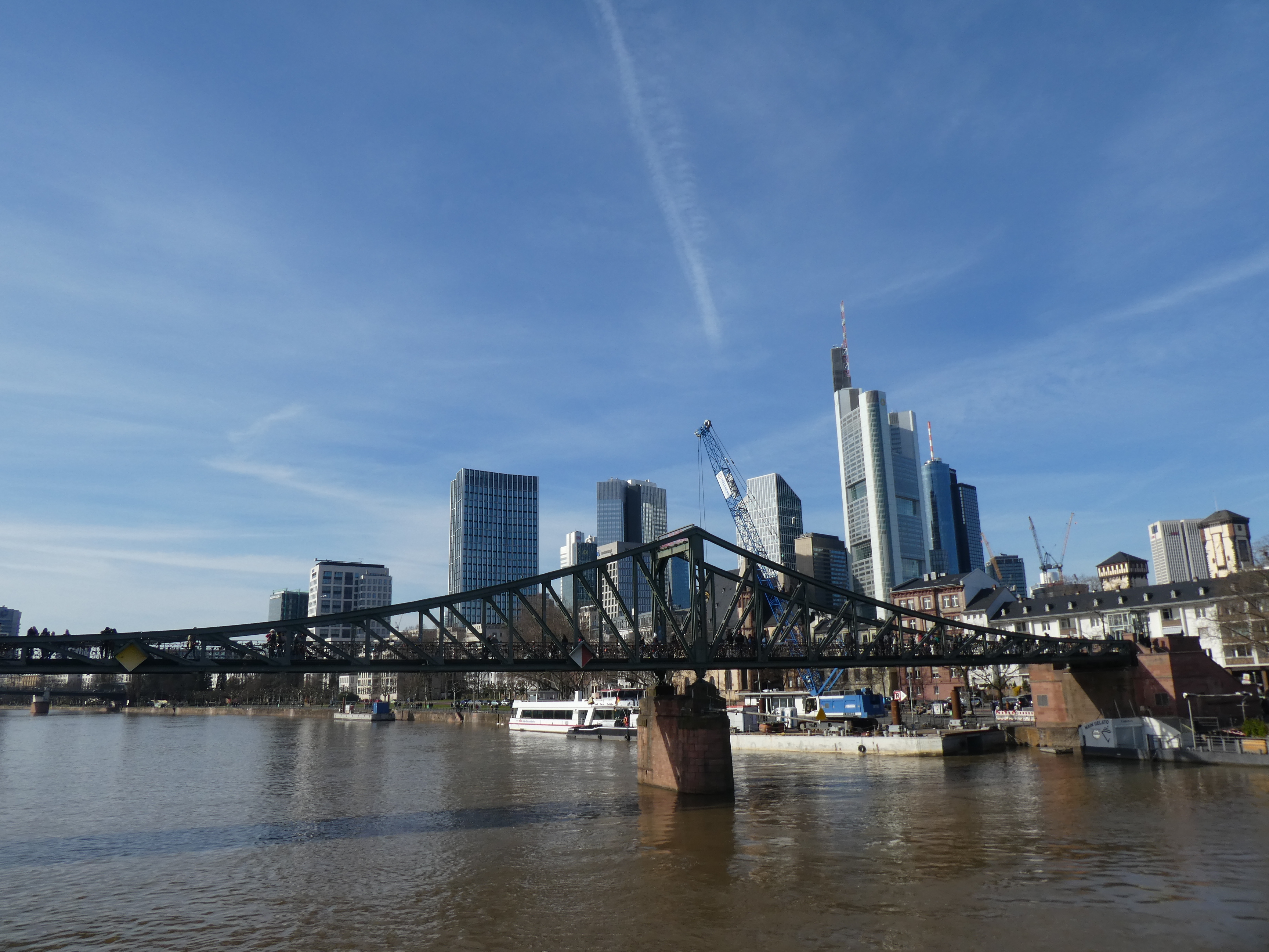 J’ai donc embarqué pour une balade sur le Main. On est d’abord descendus, en aval je crois, on est passés sous des ponts datant de diverses époques, les quais le long du fleuve (ou est-ce une rivière, l’allemand et l’anglais ne font pas la distinction) invitent à de jolies promenades, avec des bâtiments modernes et anciens, ça a un certain charme je dois dire. Je me suis mise dehors, ça pique quand même, surtout le vent. Au bout d’un moment, on a fait demi-tour pour remonter vers l’Eisenersteig, et là on a une belle vue sur le quartier financier, avec les gratte-ciels et les ponts ça fait chouette. D’ailleurs, les commentaires (en allemand et en anglais) disaient que le quartier est surnommé Mainhattan, c’est vrai que ça peut faire penser à un mini Manhattan. De retour à Eisenersteig, une partie des passagers descendent, j’ai pris le grand tour, donc je reste à bord et on repart en amont, vers le quartier financier d’ailleurs. Mais le froid a eu raison de moi et je suis descendue m’asseoir à l’intérieur et me réchauffer avec un chocolat chaud. Cela dit, ce côté était moins intéressant je trouve.