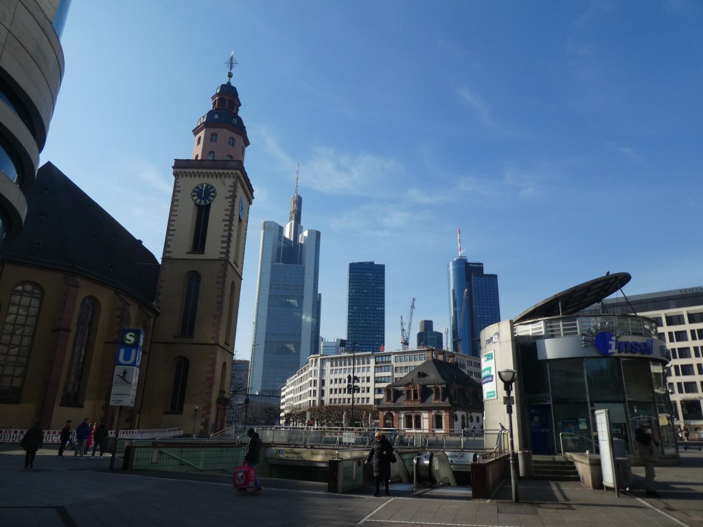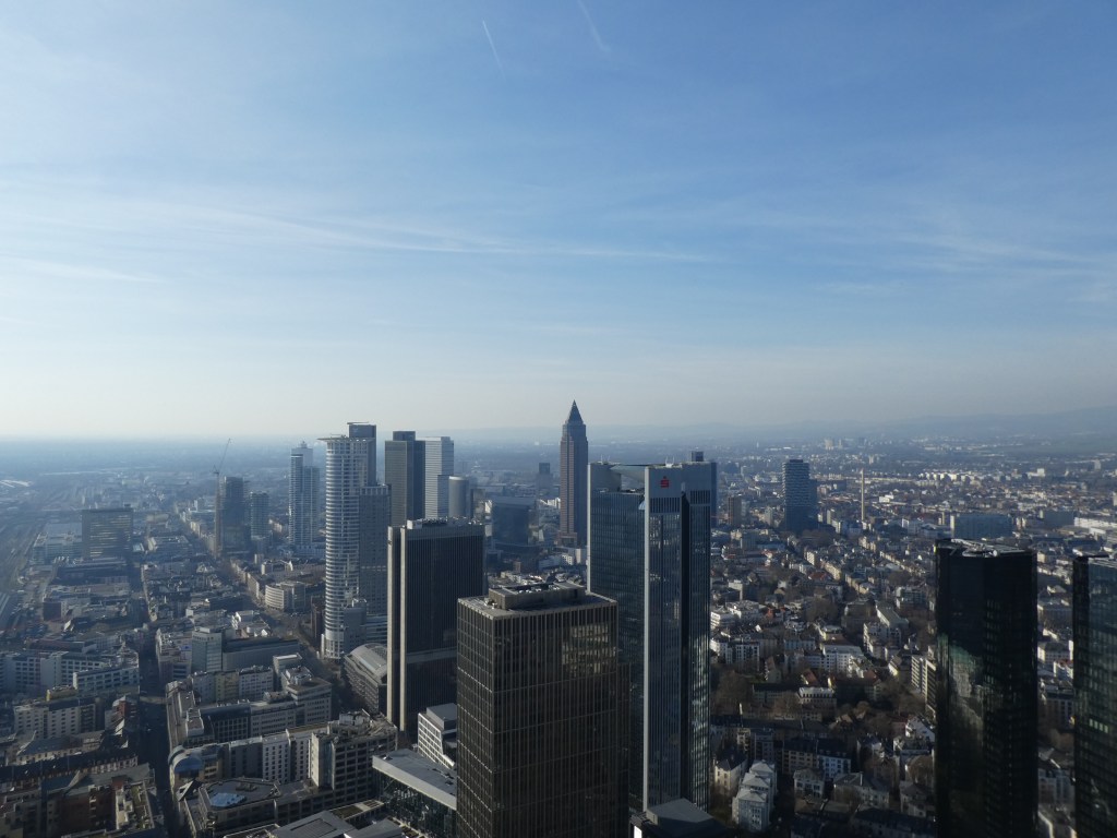 Sur ce, j’ai pris la direction de la Main Tower pour la plateforme d’observation. Y’avait déjà une sacrée file d’attente, j’ai hésité, mais bon, je voulais vraiment y aller, il est fort peu probable que je revienne à Francfort, y’avait pas grand-chose d’autre à voir a priori, à part peut-être des musées. Alors, j’ai pris place dans la file, au bout d’une demi-heure, j’avais pas mal avancé, donc j’ai décidé de rester dans la file. Au final, un peu plus d’une heure d’attente, mais ça valait le coup. Après quelques minutes dans un ascenseur à près de 20 km/h, puis encore quelques marches, me voici à environ 200 mètres de haut. Il y a une superbe vue panoramique sur la ville, le soleil brille, c’est vraiment chouette. Y’a de quoi s’asseoir, j’ai alterné entre profiter de la vue assise ou debout, observant aussi les gens. J’ai passé une bonne heure en haut, en même temps, une heure à faire le pied de grue et 9 €, autant rentabiliser.