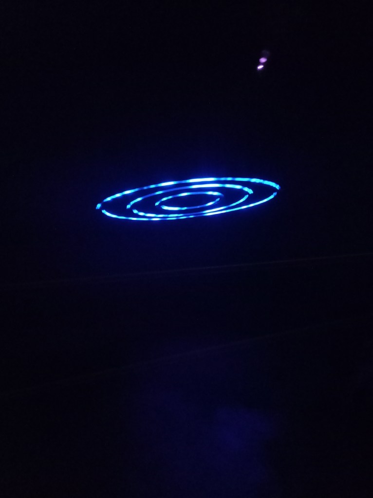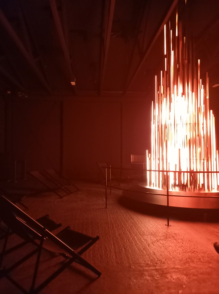 J’ai vraiment été émerveillée, j’ose à peine imaginer les heures de travail et la précision pour que chaque note soit en parfait accord avec chaque mouvement et chaque illumination. Il y a dans chaque pièce de quoi s’asseoir, et même là où des transats ou des coussins sont installés au plus près de l’installation, des bancs sont également contre le mur pour ceux qui ne seraient pas à l’aise allongés.