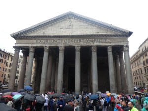 Donc, dimanche après-midi, après notre excellent déjeuner, nous avons pris la direction du Panthéon, la pluie s’était bien calmée, le soleil revenait. En route, nous avons fait une petite pause dans une bijouterie, j’ai craqué pour des boucles d’oreille (quelle originalité). Arrivées au Panthéon, on a décidé de faire l’impasse sur la visite de l’intérieur. C’est gratuit, mais la file était trop longue, je ne sais même pas si c’est possible de réserver d’ailleurs. À la place, nous sommes allées dans la salumeria à côté, « salumeria » vient de « salami », ils y vendent des saucissons, des fromages, du vin, sur place, à emporter, des sandwichs, des boissons. Je me suis pris un salami et un morceau de fromage, du pecorino romano, ils avaient coupé un peu des fromages et saucissons, on pouvait donc goûter.