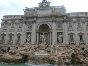 Hier matin, pour notre dernière journée à Rome, nous nous sommes mises en route un peu plus tard que les autres jours. Sous une pluie fine, nous avons pris le bus et sommes allées à la Fontaine de Trevi. Elle est vraiment magnifique. Vu la foule (j’ose pas imaginer comment c’est un week-end de haute saison par beau temps), nous ne sommes pas restées longtemps et avons flâné jusqu’à la place d’Espagne et les célèbres marches, sous une pluie de plus en plus insistante.