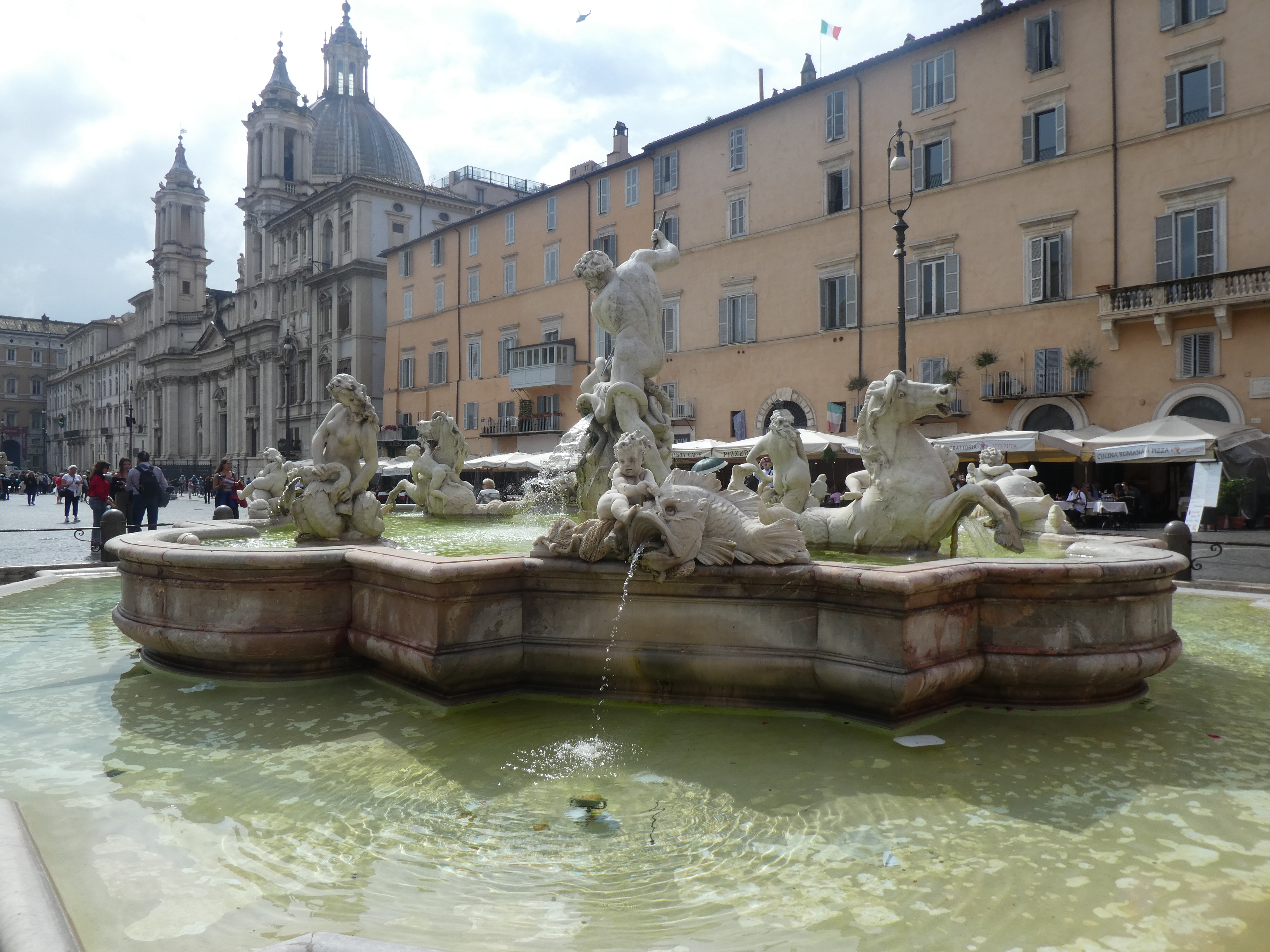Nous avons fait une pause dans une petite épicerie et avons fait le plein de pâtes artisanales. Puis nous avons repris notre balade humide, errant au gré du vent. Jusqu’à ce que nous n’en puissions plus… Nous avons fait une pause au sec avec un bon chocolat chaud dans une sorte de café/snack, leurs pizzas sentaient bon, mais c’était encore trop tôt pour nous pour manger. La pluie se calmant, nous avons continué, vers Piazza de Popolo et un peu au-delà, avant de faire demi-tour et d’essayer de trouver la célèbre Piazza Navona.