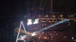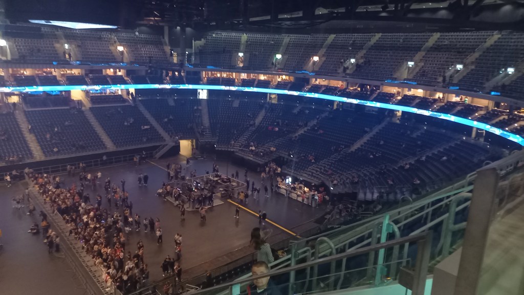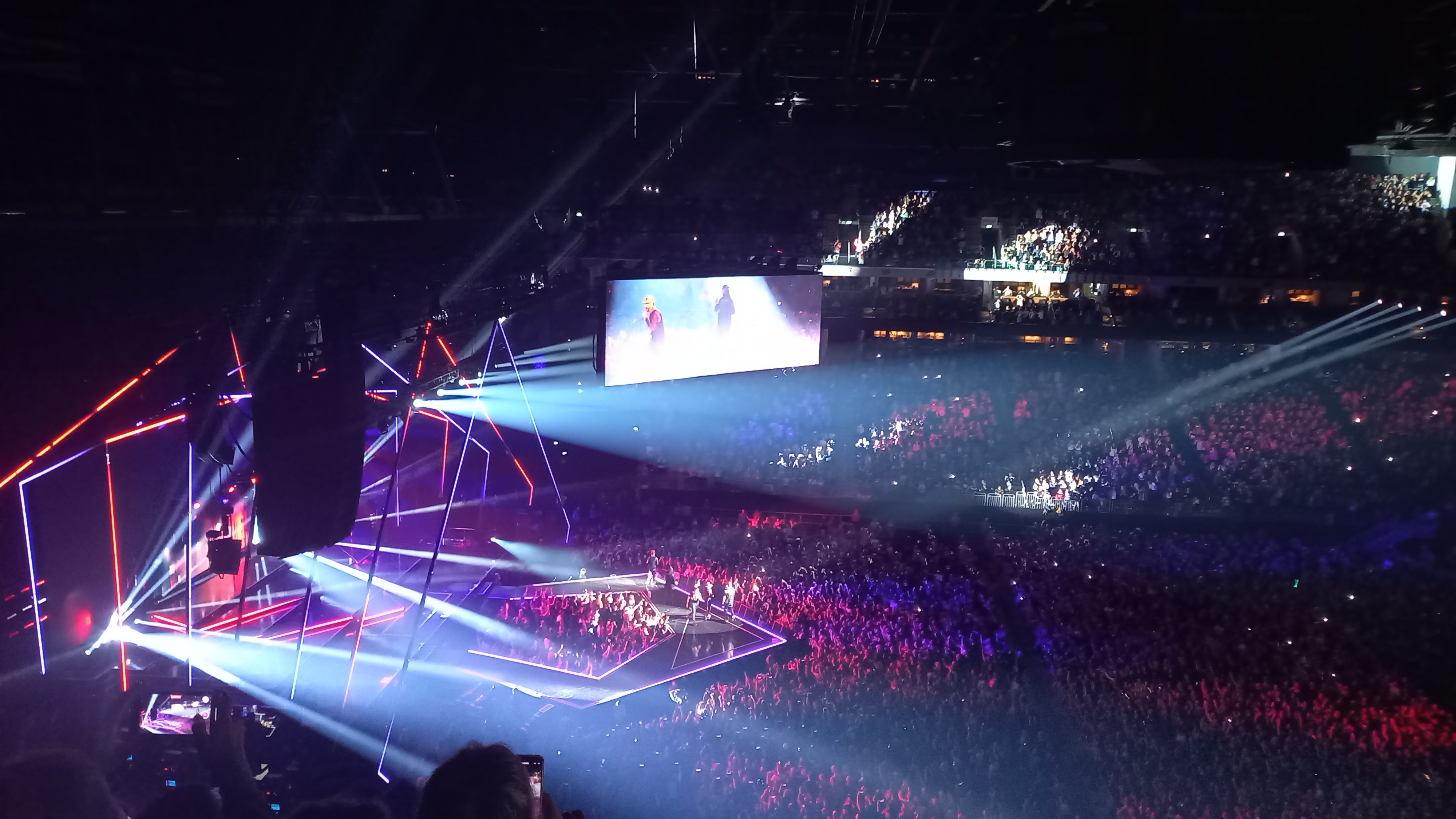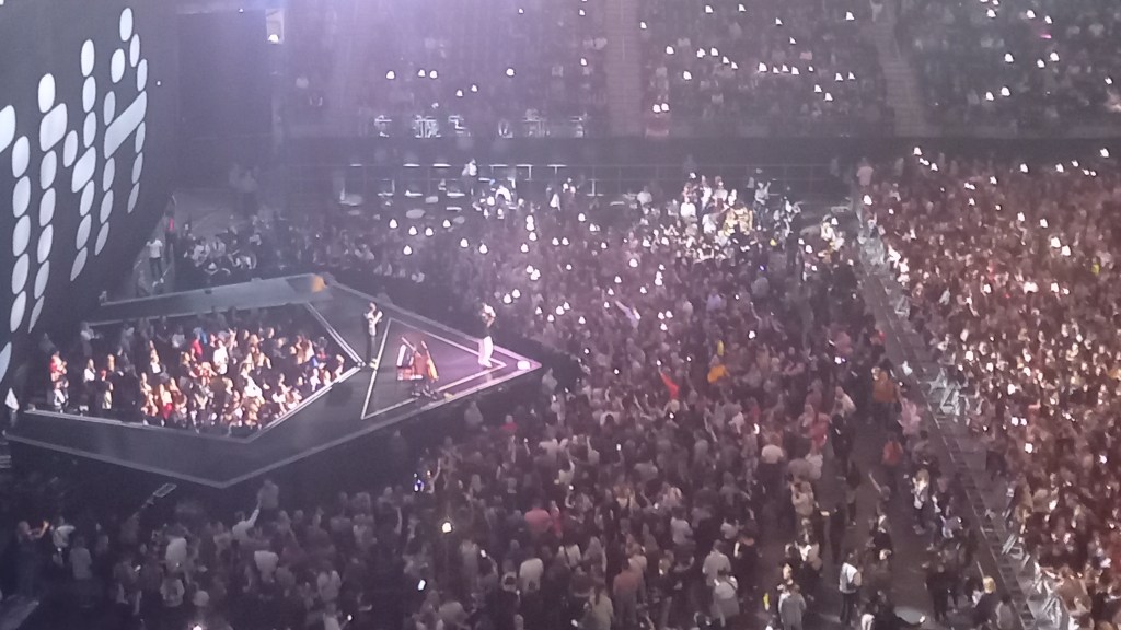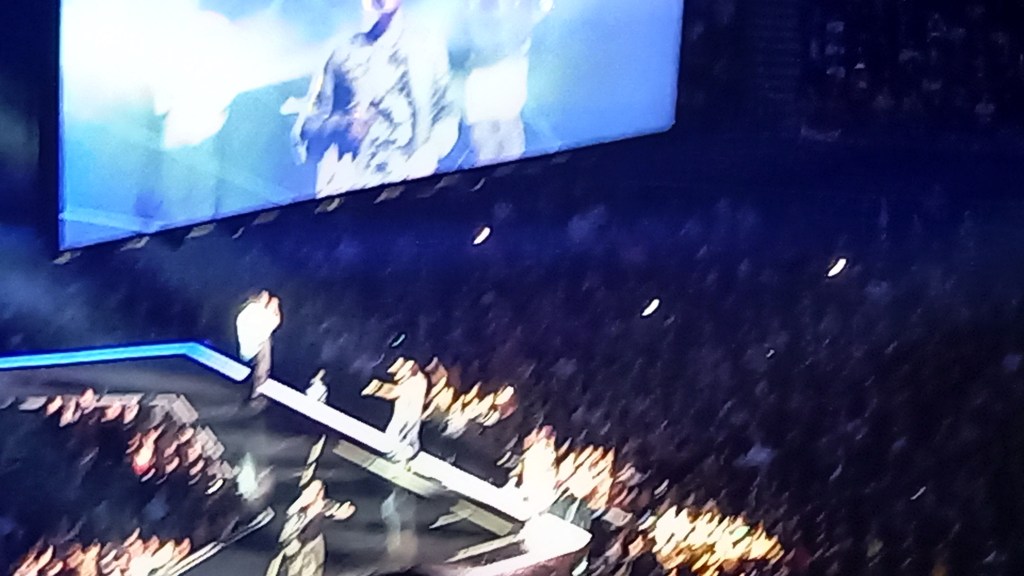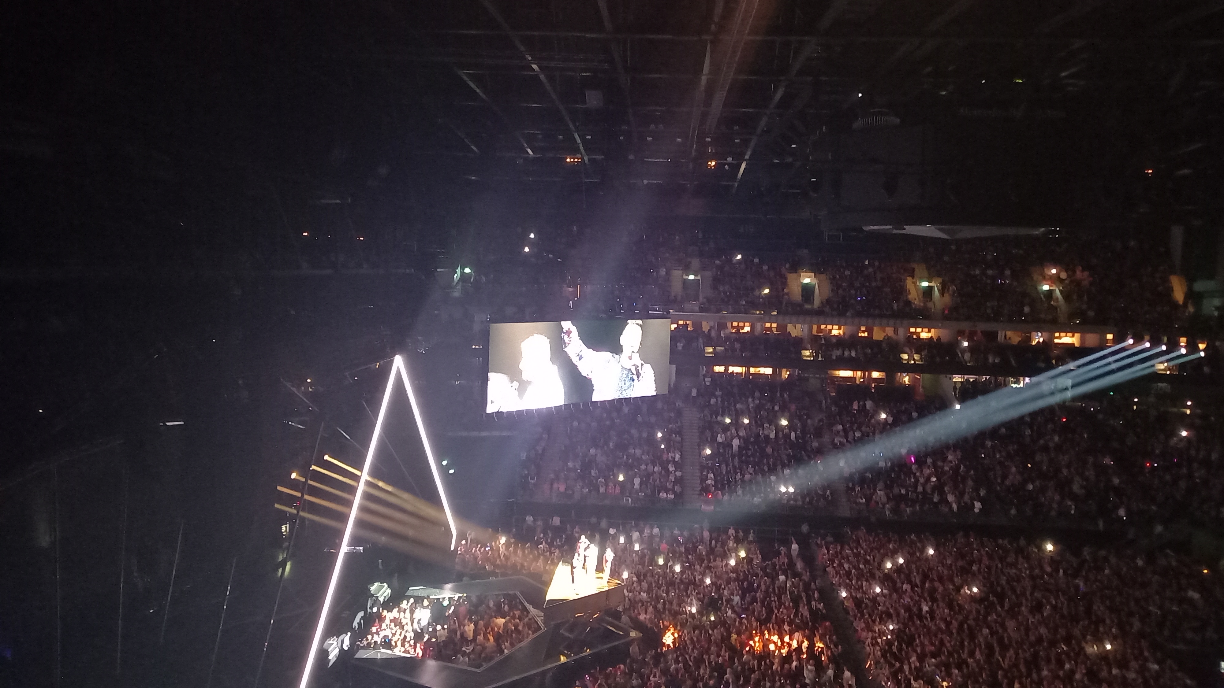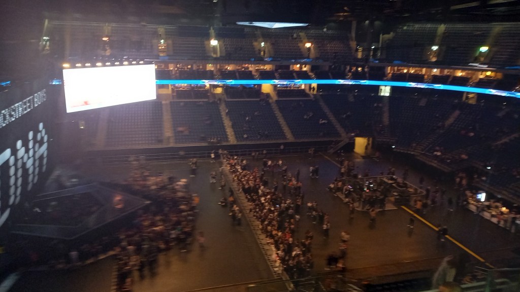 Le jour J, m’attendant à une file d’attente impressionnante, je suis arrivée à peu près à l’heure d’ouverture des portes… et en cinq minutes j’étais à l’intérieur. Mais l’accès au dernier étage est resté fermé un long moment. L’occasion de manger un morceau et de constater que les prix des stands sont plus élevés que pour les matchs… J’ai fini par prendre place, heureusement que je n’ai pas le vertige car c’est assez pentu en haut, en plus d’être élevé bien sûr. L’attente fut longue, puis la première partie avec un artiste local pas trop mal.
