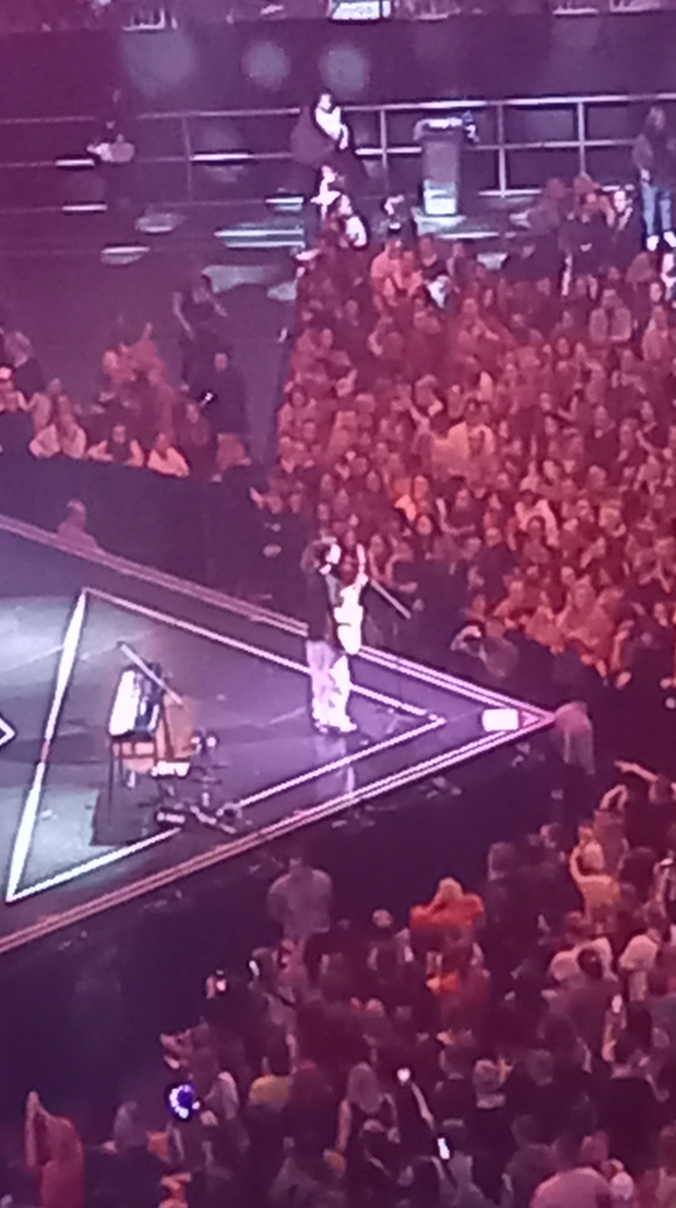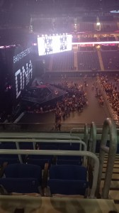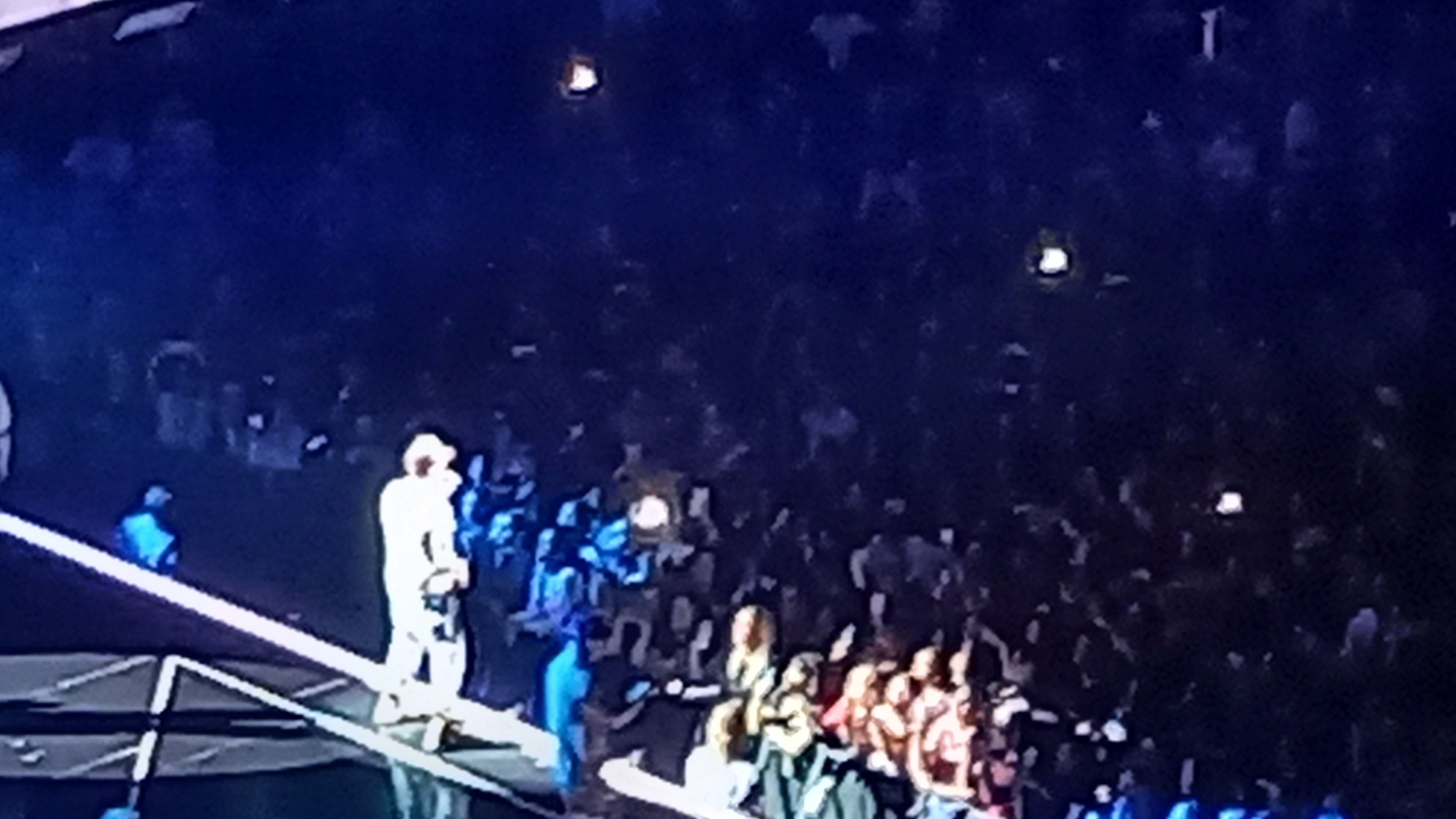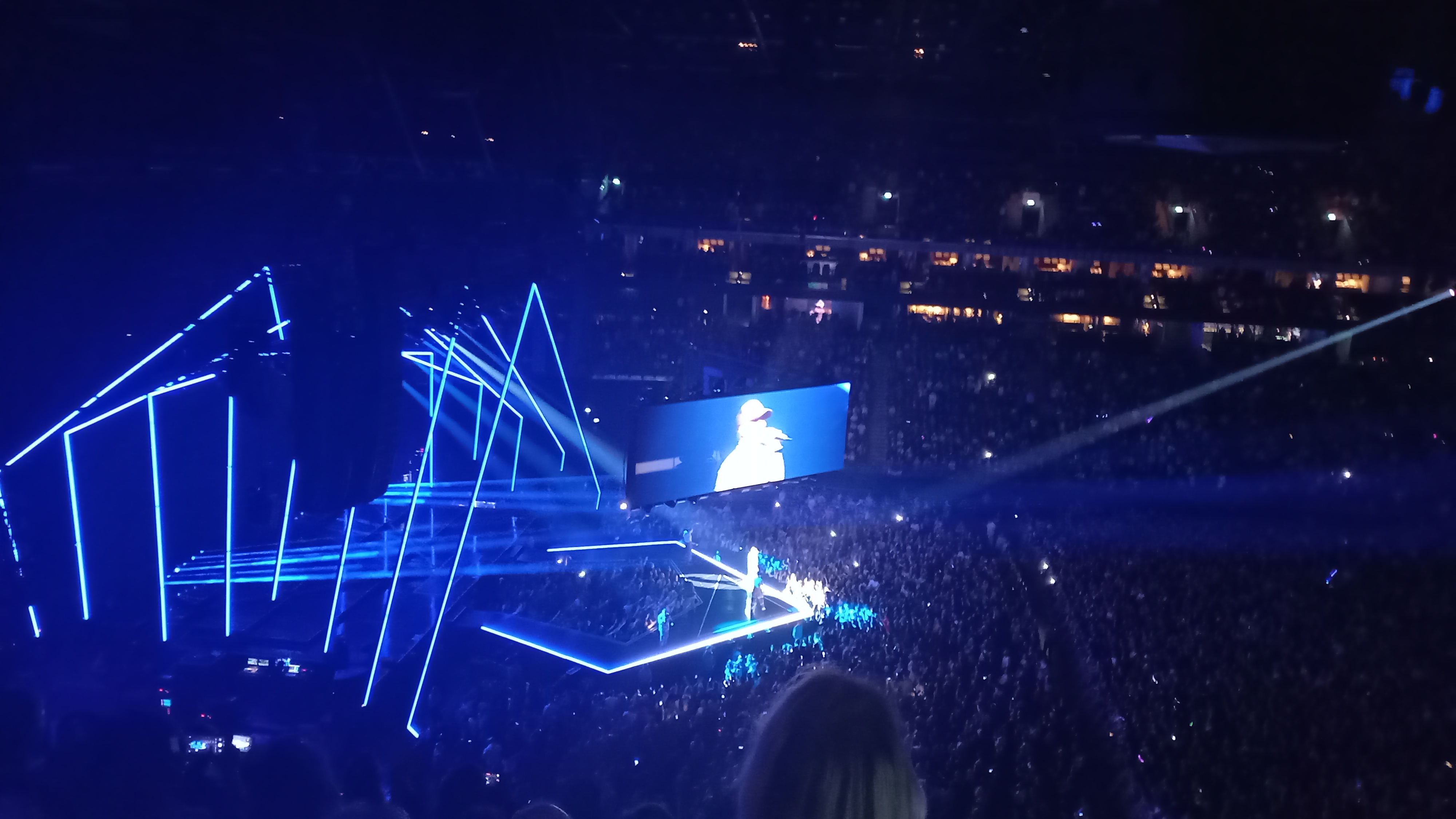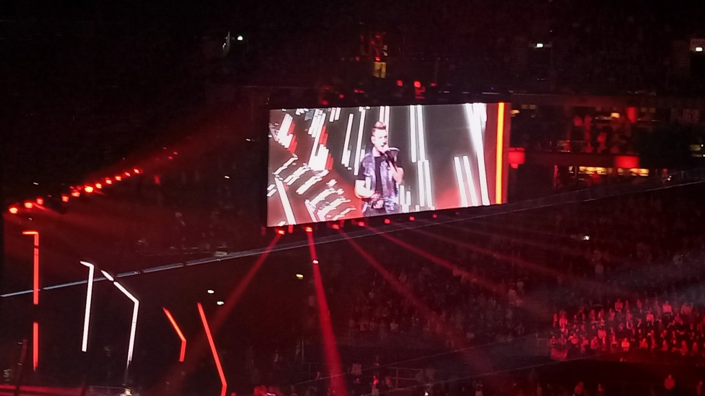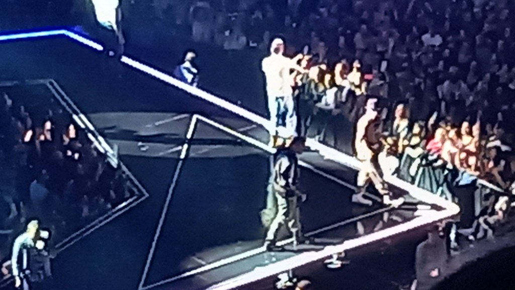 Le jour J, m’attendant à une file d’attente impressionnante, je suis arrivée à peu près à l’heure d’ouverture des portes… et en cinq minutes j’étais à l’intérieur. Mais l’accès au dernier étage est resté fermé un long moment. L’occasion de manger un morceau et de constater que les prix des stands sont plus élevés que pour les matchs… J’ai fini par prendre place, heureusement que je n’ai pas le vertige car c’est assez pentu en haut, en plus d’être élevé bien sûr. L’attente fut longue, puis la première partie avec un artiste local pas trop mal.