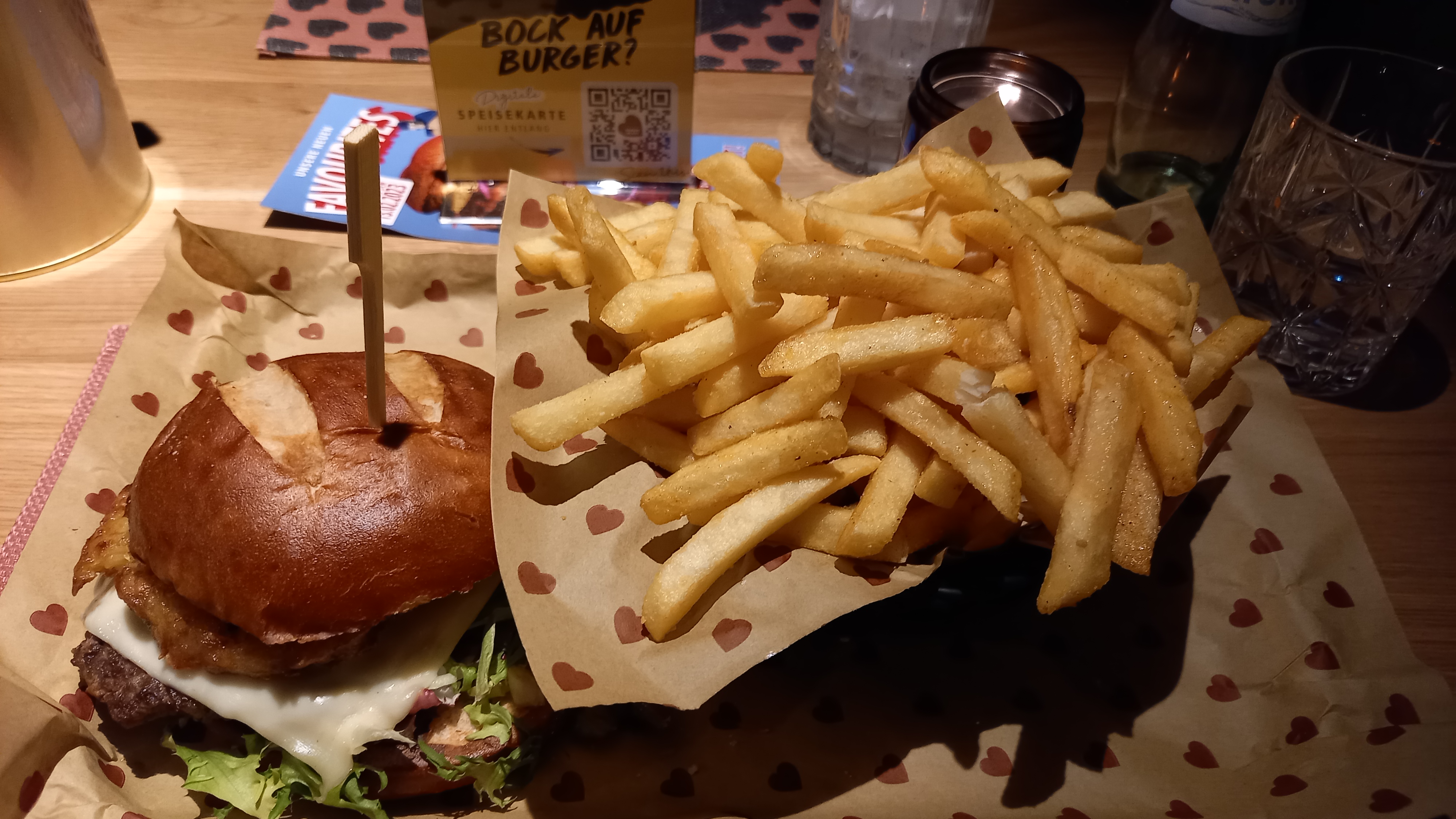 Après avoir déambulé dans la gare, le train arrive, je m’installe et là on nous annonce que le conducteur a du retard… Bravo la Deutsche Bahn. Donc, environ une heure plus tard que prévu, je suis enfin arrivée à Aix-la-Chapelle. En moins de dix minutes de marche, je suis arrivée au Motel One, j’ai pris mes quartiers, je me suis un peu posée et je suis allée dîner juste à côté au Burgerheart que j’avais repéré sur Google Maps. Assez sympa, serveur top, le cosmo et l’autre cocktail pas mal. Les frites sont un peu trop salées à mon goût et le burger, pas mal. J’avais pris un Matterhorn : bœuf, rösti, salade, oignons grillés, emmental, pain bretzel. Le steak était un peu trop cuit à mon goût, mais sinon, pas mal.