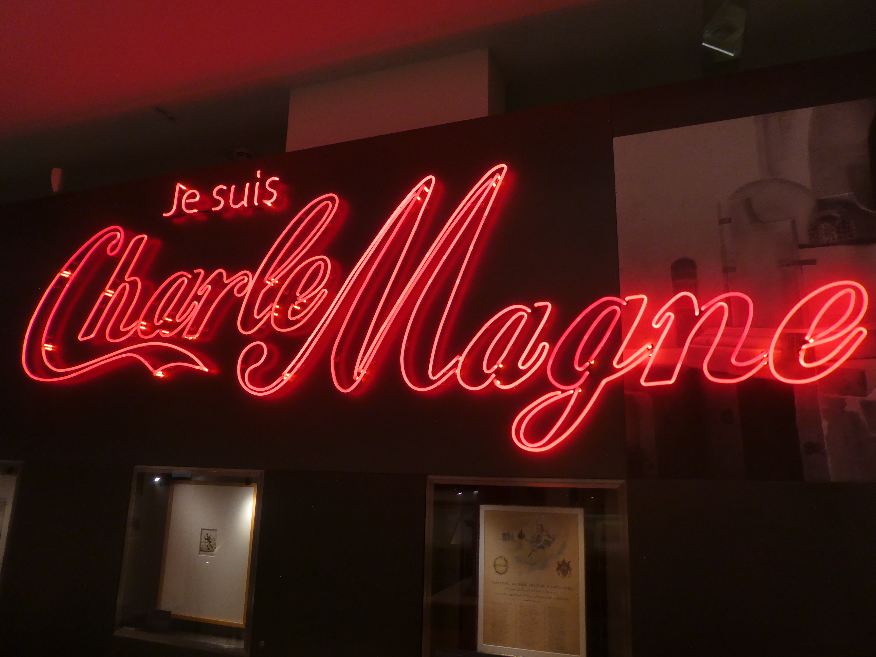 Après un bon petit-déjeuner bien copieux, je me suis mise en route pour rejoindre mon amie. Sous la pluie, j’ai pris le chemin du Centre Charlemagne, en français dans le texte. C’est un petit musée de la ville, très intéressant. Sans surprise, ça parle pas mal de Charlemagne, des Carolingiens, même de Napoléon. Ensuite, nous nous sommes installées au chaud dans un petit café/boulangerie. S. et moi avons des rythmes différents, pour elle c’était donc l’heure du déjeuner. J’ai pour ma part pris un petit bretzel fourré au fromage frais pour plus tard.