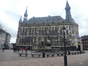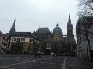 Sur ce, nous sommes retournées du côté de la cathédrale, la pluie s’étant arrêtée entre-temps. Normalement, il y a plusieurs visites guidées du monument, mais comme ce soir il y a un concert, ce n’était pas le cas aujourd’hui. Cette cathédrale, construite à la demande de Charlemagne, est plus petite que je ne pensais, mais très jolie.