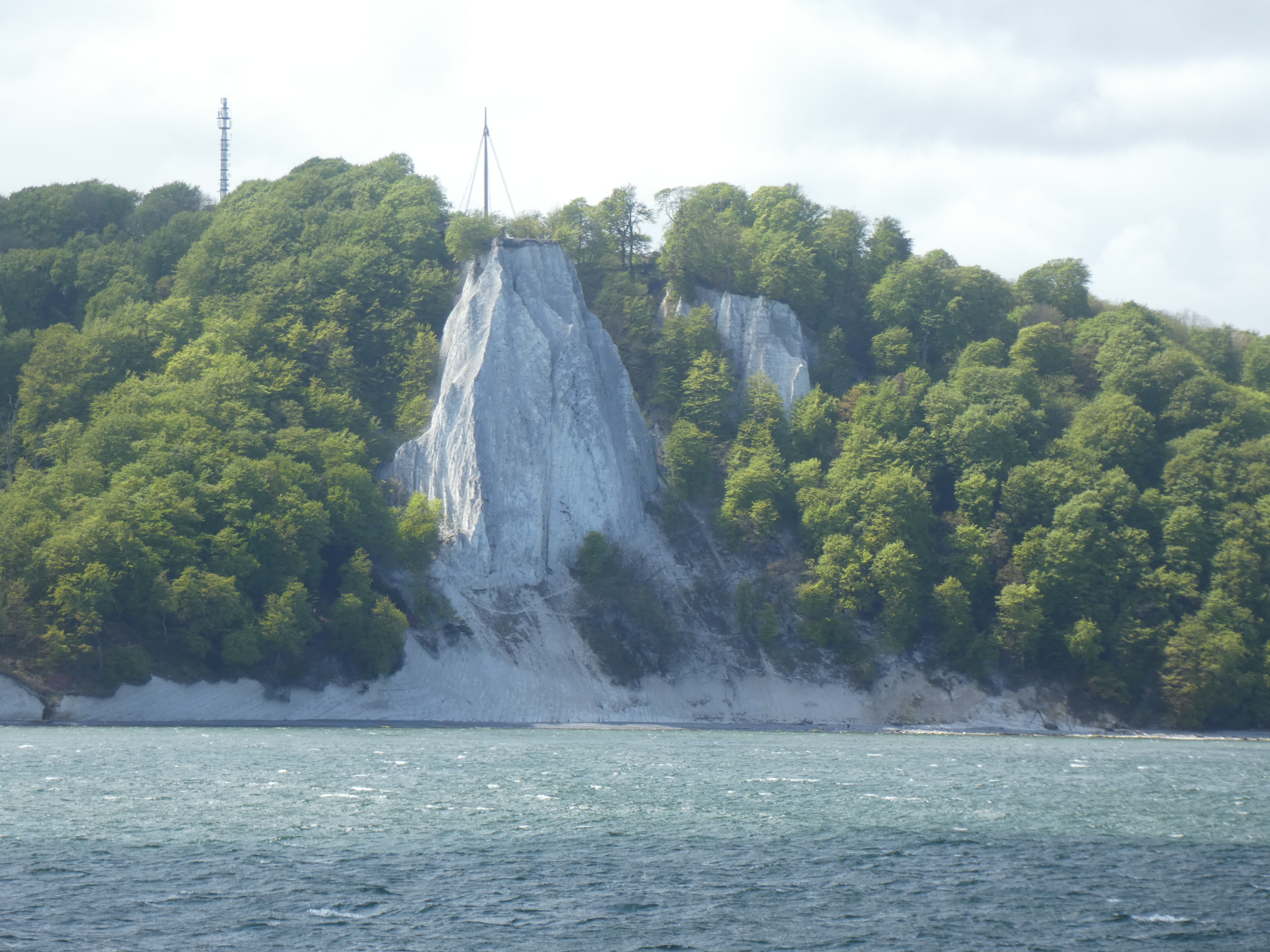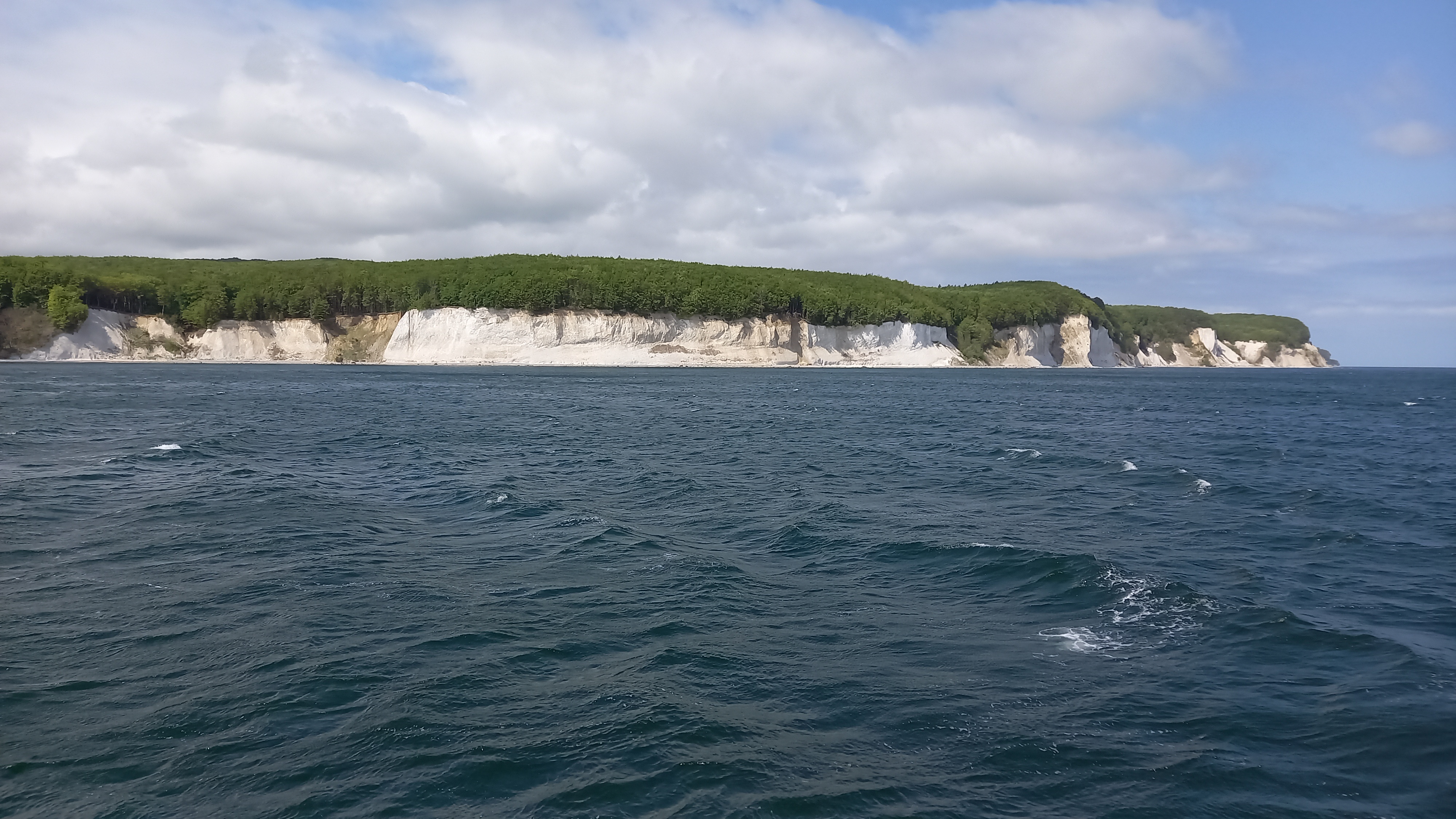 Nous avons ensuite fait demi-tour pour retourner vers le ponton de Binz. Le vent soufflait fort aujourd’hui, avec beaucoup de nuages dans la matinée. Aux alentours de midi, nous avons embarqué sur le MS Mönchgut de la compagnie maritime Adler pour aller voir les falaises de craie du parc national de Jasmund, près de Sassnitz. Nous avons pris place à l’intérieur, sortant de temps en temps affronter le vent et le froid pour prendre des photos et profiter du paysage mieux que derrière une vitre. Alors que nous approchions des falaises, le soleil a fait son apparition, rendant encore plus étincelants les pans de craie blanche surmontés de bois verts. C’était la troisième fois que je faisais ce tour, c’est toujours aussi magnifique.