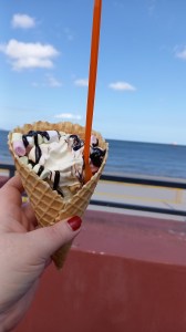 Arrivées à Binz dans l’après-midi, nous avons tout de suite pris nos quartiers à l’hôtel, chacune sa chambre, et une heure plus tard, nous sommes allées nous balader au bord de la plage, au ponton, dans la rue commerçante… Puis nous avons commencé à regarder pour le dîner, principalement sur la promenade. Forcément, il y a pas mal de poisson ici, ce que je ne mange pas, mais V., si. Au final, nous sommes allées à Weltbummler, ce qui signifie en gros globe-trotteur, un restaurant-bar très sympa aux mille bouteilles. On a commencé avec des cocktails, puis de la poitrine de poularde élevée au maïs pour moi et des pâtes au pesto et aux gambas pour V., et pour finir, un gin tonic à la fraise. C’était très bon, le personnel est sympa et les prix corrects.