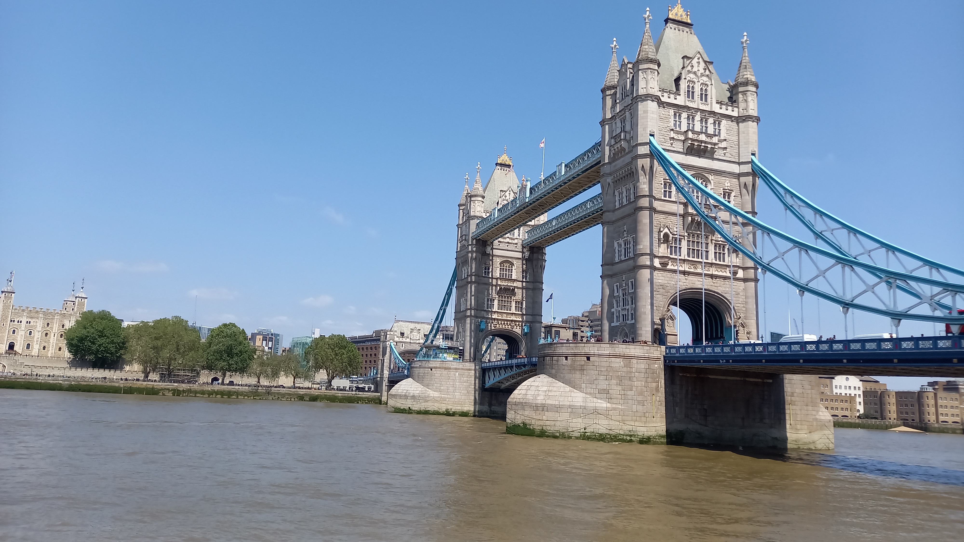 Après cela, nous avons repris notre balade, suivant plus ou moins le cours du fleuve, car les bords ne sont pas praticables tout du long. Nous sommes alors arrivées à destination : le Tower Bridge, le pont emblématique de la capitale anglaise. De là, on a également une belle vue sur l’ensemble de la Tour de Londres sur la rive opposée. Il faudrait vraiment que j’aille la visiter un jour.