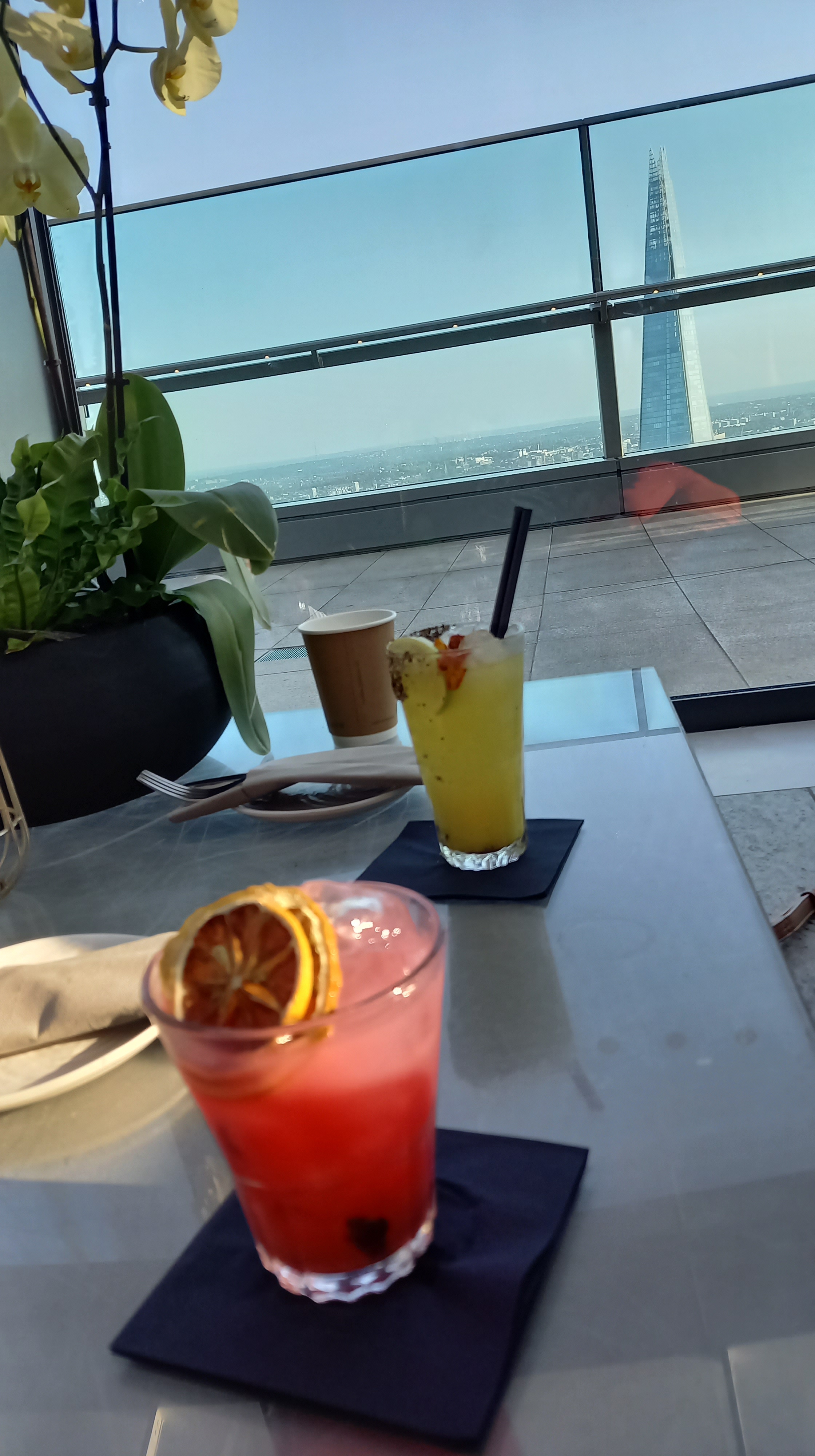 À l’heure de notre réservation, on nous a menées à notre place : dans un canapé près de la baie vitrée avec vue sur le gratte-ciel The Shard. Ils ont des cocktails signature, mais font aussi les classiques sur demande. Nous en avons pris chacune deux, tout en dégustant une bonne planche de charcuterie et fromage, profitant de la vue sous le ciel bleu londonien. C’était vraiment chouette.