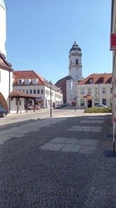 Nous sommes donc remontées en ville pour trouver où déjeuner et nous avons opté pour le restaurant italien Castillo près de la cathédrale, avec une belle terrasse ombragée bordée d’un petit jardin. Les plats étaient pas trop mal, rien d’exceptionnel, cela dit la portion de lasagnes était minuscule. Du coup, nous sommes allées prendre notre dessert dans un petit café pas loin. Nous avons établi que nous avions vu presque tout ce qu’il y avait à voir à Fürstenwalde, du côté ville en tout cas, car les alentours offrent de beaux coins de nature a priori. Nous n’étions pas d’âme aventurière et avons laissé les quelques rues encore inexplorées pour reprendre le chemin vers la gare, en bus cette fois, la chaleur et le soleil nous ayant porté un coup fatal. Oui, oui, j’exagère, mais après quelques semaines de fraîcheur, 30°C, un ciel bleu sans nuage et un soleil ardent, ça a son effet. Et nous avons ainsi aussi fait l’impasse sur les répétitions du concert.