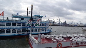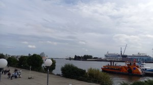 Une fois installée, je suis allée me promener un peu, direction le bord de l’Elbe et Landungsbrücke où partent pas mal de bateaux. En route, je me suis arrêtée dans un petit café qui servait le petit-déjeuner jusque 16h, donc des œufs brouillés avec lardons, ça fait l’affaire. Une fois arrivée « en bas », je me suis baladée le long de l’eau, m’offrant encore une petite crêpe sucre-cannelle. Le temps était d’abord ensoleillé, presque chaud même avec 18°C, puis la pluie est venue se mêler à la fête. Comme j’étais juste en face d’une station de métro à ce moment-là, je suis rentrée à l’hôtel, j’avais un peu de boulot.