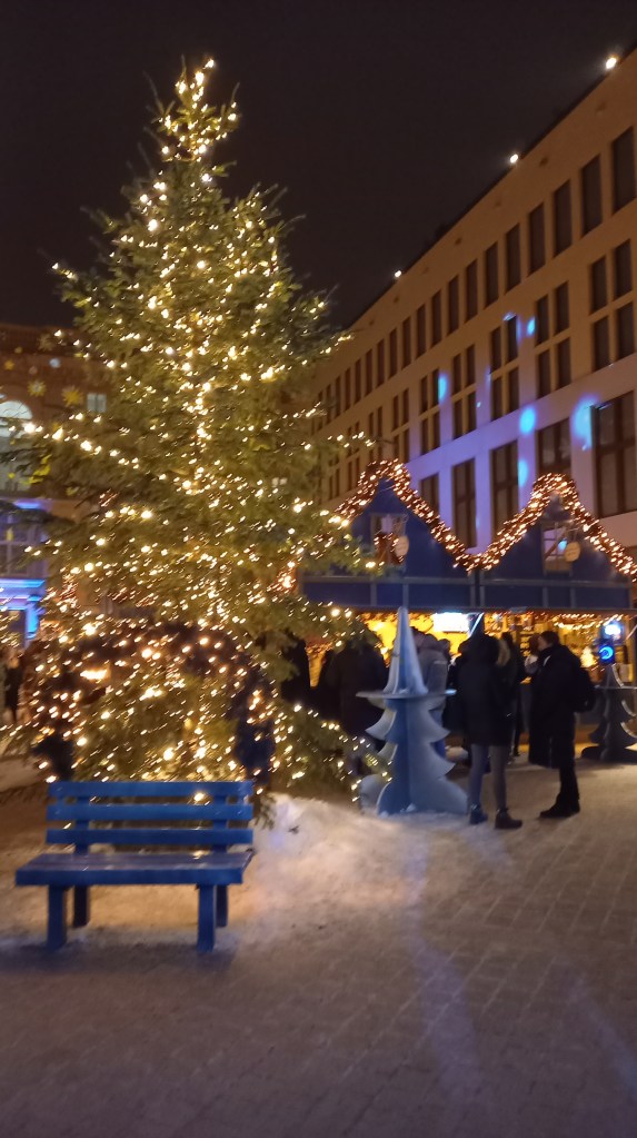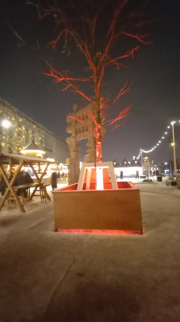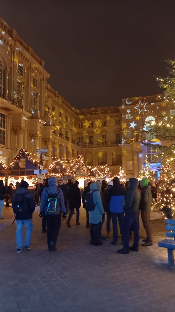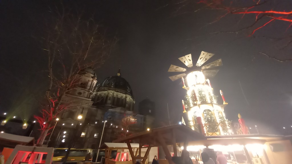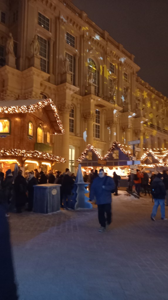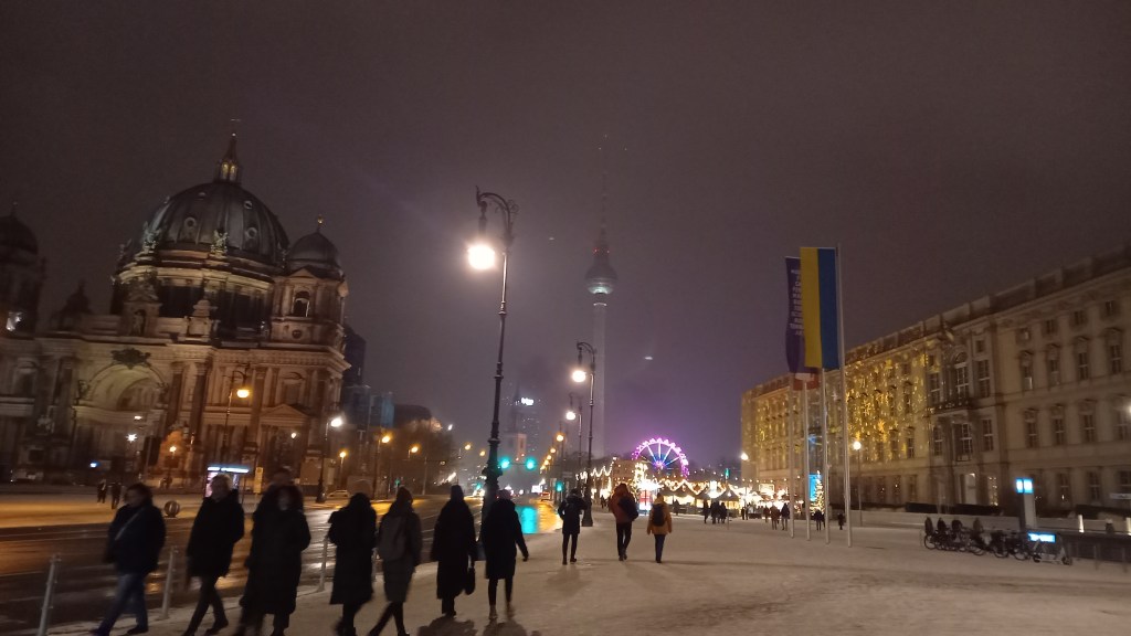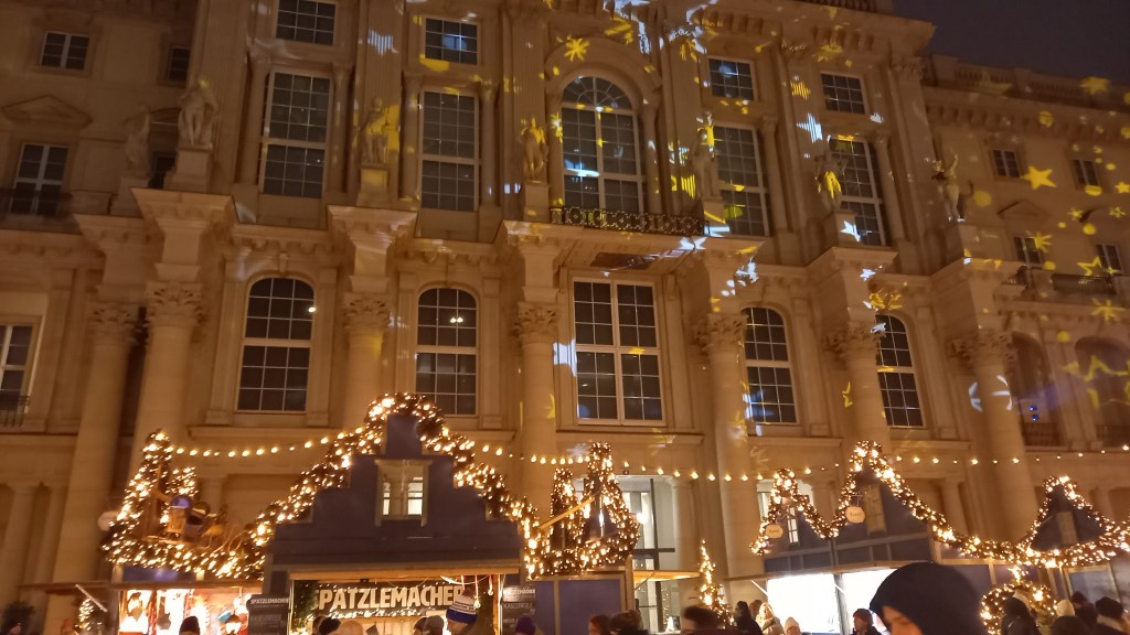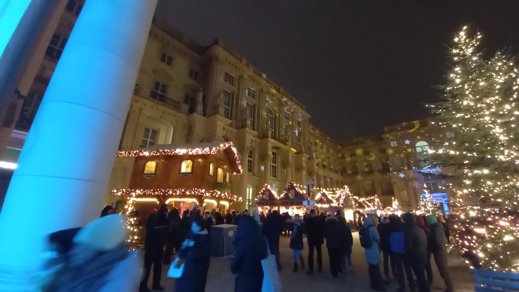La saison des marchés de Noël bat son plein et j’en ai déjà un peu profité. Cette année, il y a un petit nouveau : le Wintermarkt am Humboldt Forum, Wintermarkt pour marché d’hiver. Situé au forum Humboldt et au château, entre Alexander Platz et l’opéra, face à l’île aux musées, la grande place devant le château et la cour intérieure vous accueillent dans une atmosphère féerique. J’ai eu la chance de le voir sous la neige. Au programme, lumières dansantes sur les façades, illuminations pour éclairer la morosité de l’hiver, cabanons pour admirer, se réchauffer, se régaler. Un marché de Noël assez classique dans un cadre magnifique.
