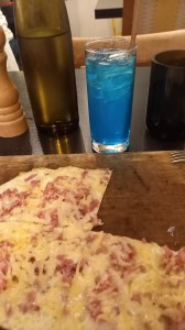 Peu de temps après, malgré la pluie, je suis allée déjeuner dehors. Direction le restaurant La Fignette un peu plus dans le centre que l’on m’avait recommandé. « Un bistro à l’accent alsacien » qu’ils disent. Assez sympa. Ils font des tartes flambées que l’on peut aussi commander en demi, du coup, j’ai pris une gratinée (lardons, oignons, emmental) en entrée, avec un petit cocktail vodka-curaçao-citron. Le choix du plat principal a été dur. J’ai hésité entre des fleischnakas (escargots à la viande), de la choucroute, le cordon bleu au munster et les spätzles grillés. J’ai pris les spätzles avec lardons et munster. Très bon. Les desserts avaient l’air sympas, mais j’étais rassasiée. Peut-être essaierai-je d’y retourner. J’avais ensuite prévu de me balader un peu, mais la pluie m’a renvoyée à l’hôtel, pour s’arrêter une fois de retour dans ma chambre.