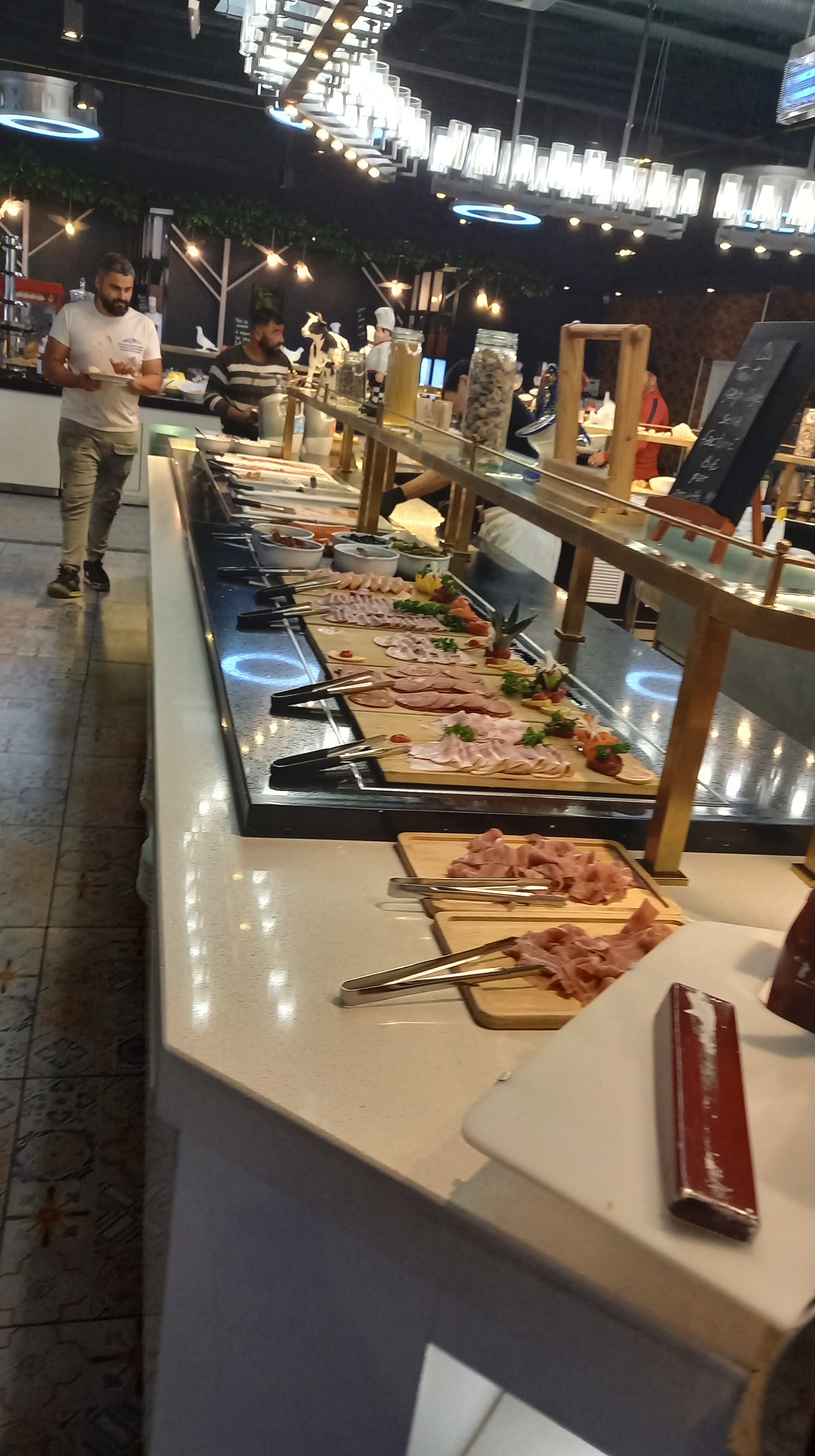 C’est un buffet avec une station grillade (viande et poisson). Il y a un prix unique qui varie selon les moments, en semaine à midi 19€, le soir 24€, le week-end à midi 26€ et le soir 29€, si je me souviens bien. Les boissons sont en plus bien sûr et, apparemment, si on ne finit pas son assiette, il y a un supplément à payer. C’est pour éviter le gaspillage, que les gens ne se fassent pas d’énormes assiettes qu’ils ne finissent pas. Mieux vaut y aller plusieurs fois. C’était dur de pas trop prendre, j’avoue. Au buffet d’entrées, il y a du carpaccio, de la charcuterie, des fruits de mer, des salades… Pour le plat principal, il y a des plats genre bœuf bourguignon, bouchées à la reine, pâtes, beignets de calamar ou de fromage, des frites, des nems… J’ai opté pour deux steaks, au grill, on peut prendre deux viandes par passage. Évidemment, ce sont des petites portions, sûrement moins de 200 g. J’ai demandé saignant, l’un était bien, l’autre entre saignant et à point. Ensuite, j’ai dû me contenir au fromage et aux desserts. Ils ont des glaces en bac avec diverses sauces et garnitures, mais aussi une machine pour glaces à l’italienne, fraise et vanille, c’est ce que j’ai pris. J’étais donc bien rassasiée. Le soir, je n’ai presque mangé.