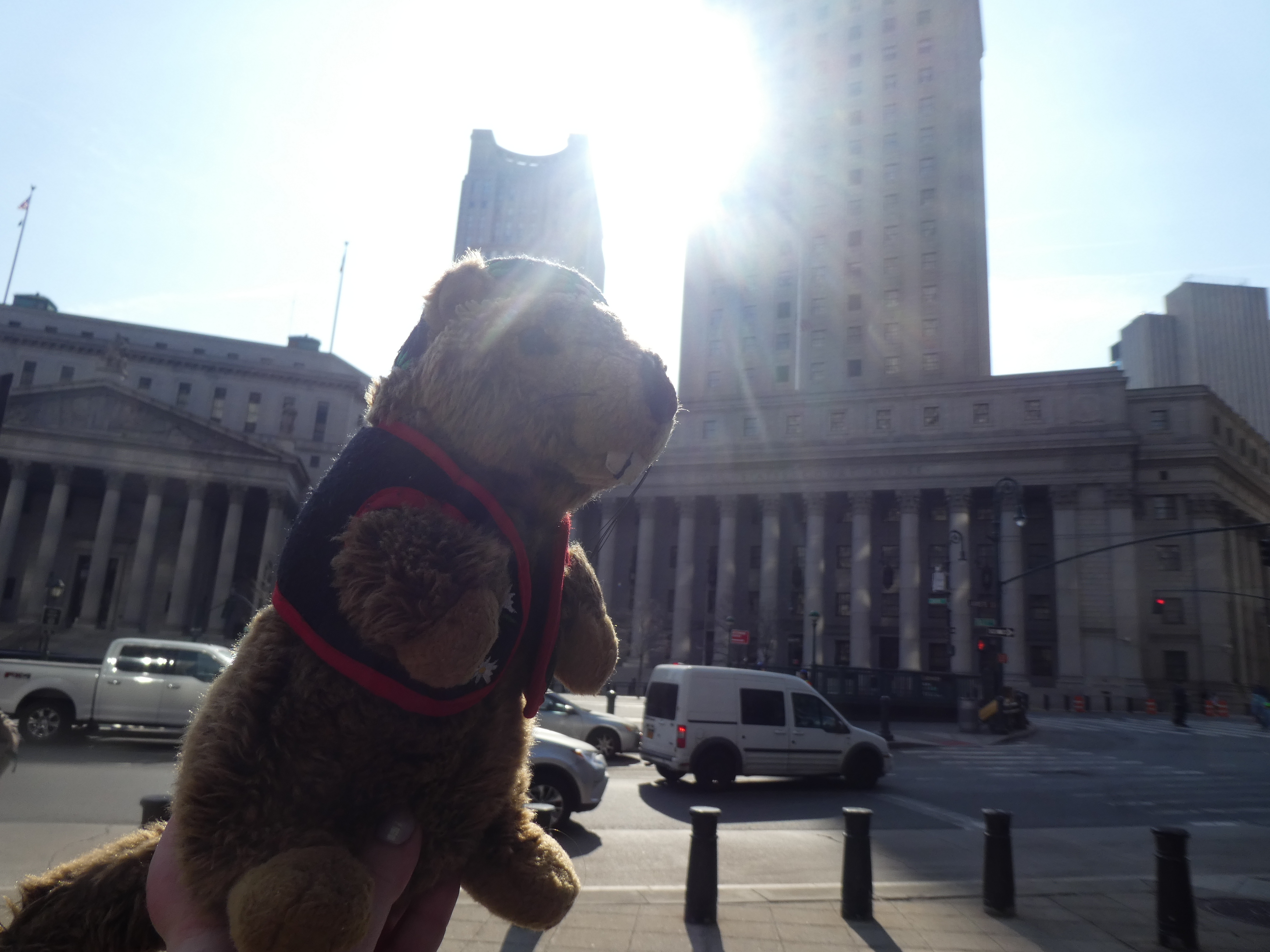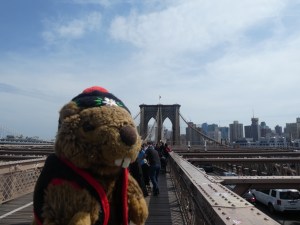 À défaut de pouvoir prendre des photos du taureau, nous sommes allées au musée des indiens américains dont l’entrée est gratuite. Très intéressant. Après quoi nous sommes allées déjeuner dans un haut lieu typique de la gastronomie US : MacDonald’s ! Puis, avec un beau soleil qui chauffait bien, direction le pont de Brooklyn que l’on a donc traversé, avec une belle vue sur chaque rive, vraiment une belle balade. Une fois de l’autre côté du pont, nous sommes descendues dans le parc au bord de la rivière de l’Est. C’est hallucinant certains quand-même, le nombre qui se mettent sur la route pour prendre une photo, c’est quelque chose que je ne comprendrai jamais… Enfin bref. Après une petite pause et une balade face à la magnifique baie de Manhattan, nous avons pris le ferry pour retourner de l’autre côté, histoire de rentrer se poser un peu à l’hôtel avant de sortir le soir, car après près de vingt kilomètres de marche, nous étions exténuées.