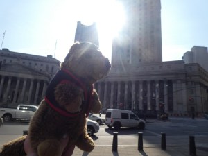 Hier matin, réveil assez tôt après une bonne nuit de sommeil. Le petit-déjeuner de l’hôtel est assez simple, mais bon. Nous avons donc attaqué la journée de bonne heure pour visiter plutôt le sud de Manhattan, suivant un itinéraire suggéré par mon guide Lonely Planet reprenant certains points que je voulais voir. On a commencé dans le quartier de Tribeca pour le café La Colombe du 19e siècle, joli bâtiment. On a fait un arrêt au QG des Ghostbusters, puis notre balade nous a menées vers la cour de justice, des quartiers alliant immeubles anciens et gratte-ciel modernes, assez sympa. Les bâtiments new-yorkais typiques avec les escaliers de secours à l’extérieur, c’est vraiment chouette. On a fait un arrêt rapide au Woolworth Building, un immeuble gothique, le hall d’entrée est impressionnant, il est même possible de réserver des visites. Nous avons voulu visiter la chapelle St Paul, mais elle était fermée pour événement privé, alors nous sommes allées au mémorial du 9/11, c’était vraiment émouvant, j’en avais la gorge serrée. On n’a pas fait le musée en raison de la file d’attente interminable, mais les bassins avec les noms, ça fait quelque chose. Ensuite, direction Wall Street, la jolie église Trinity Church dont on ne peut visiter que la chapelle et le cimetière